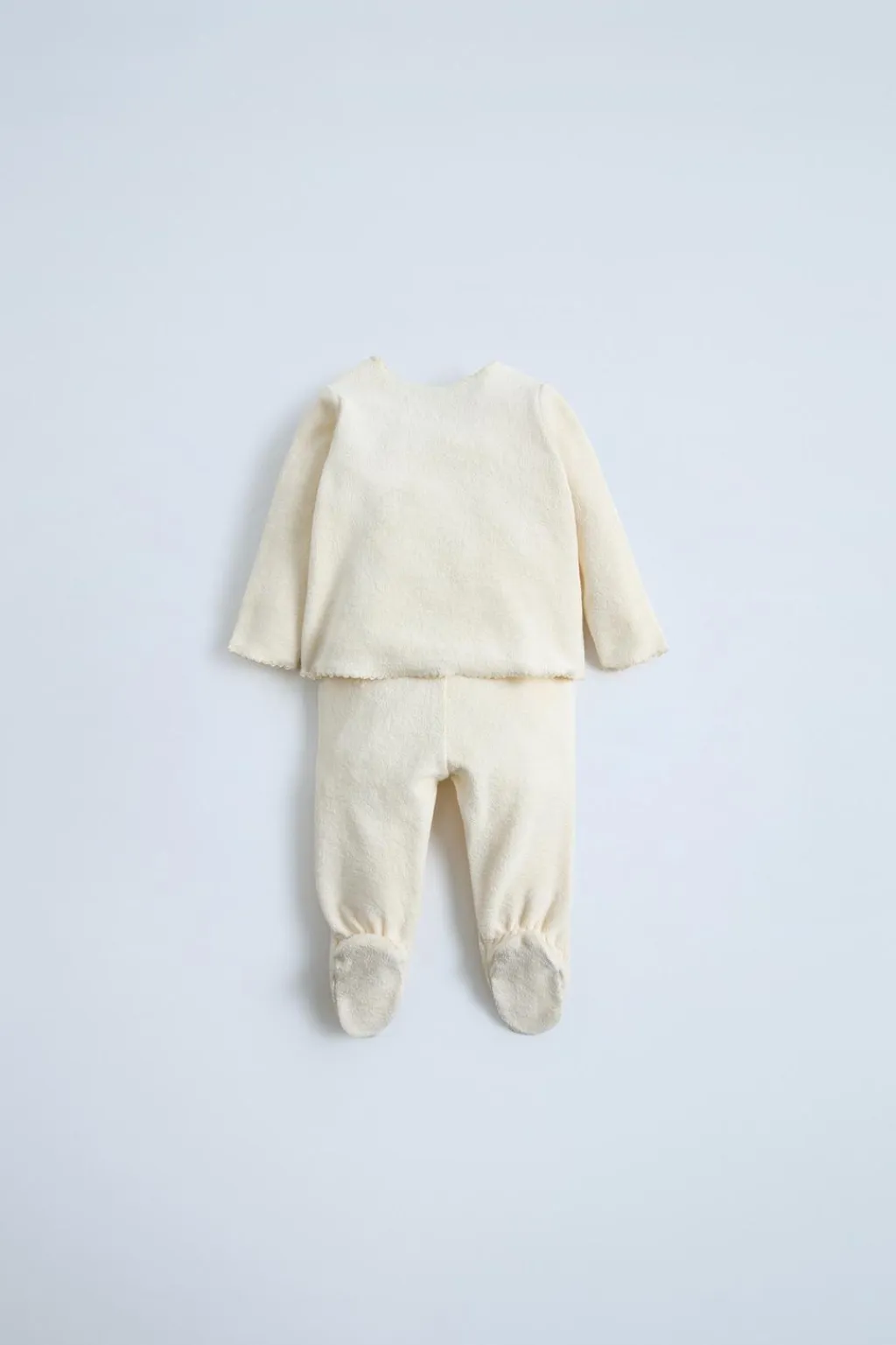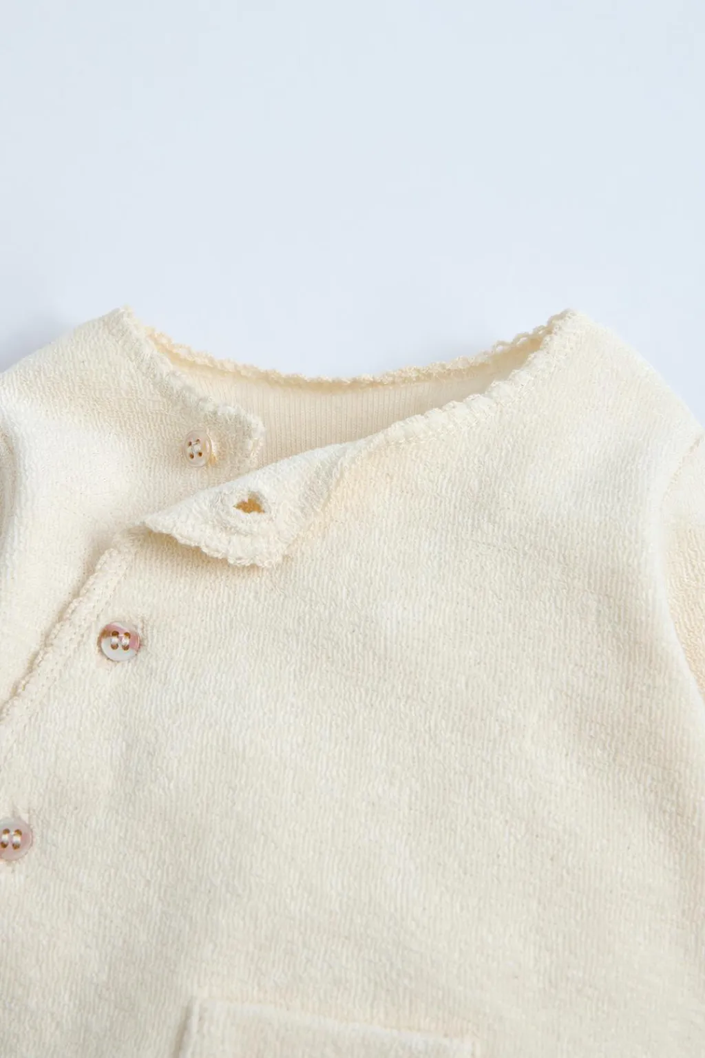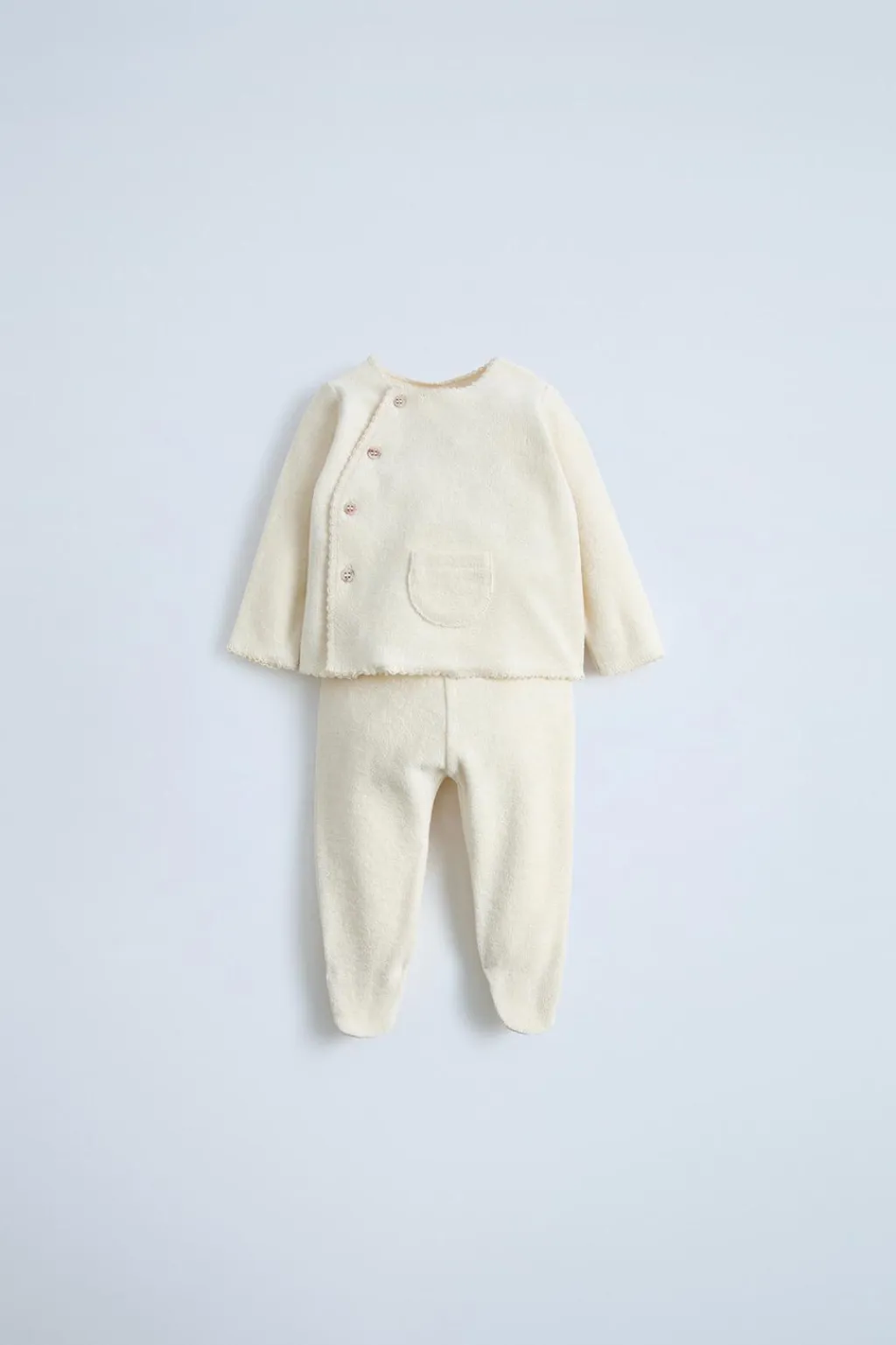 Conjunto de dos piezas. Camiseta con cuello redondo y manga larga. Cierre asimétrico con botones. Bolsillo tipo plastrón en delantero. Poilana con cinturilla elástica