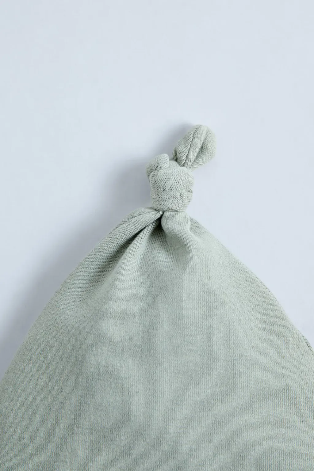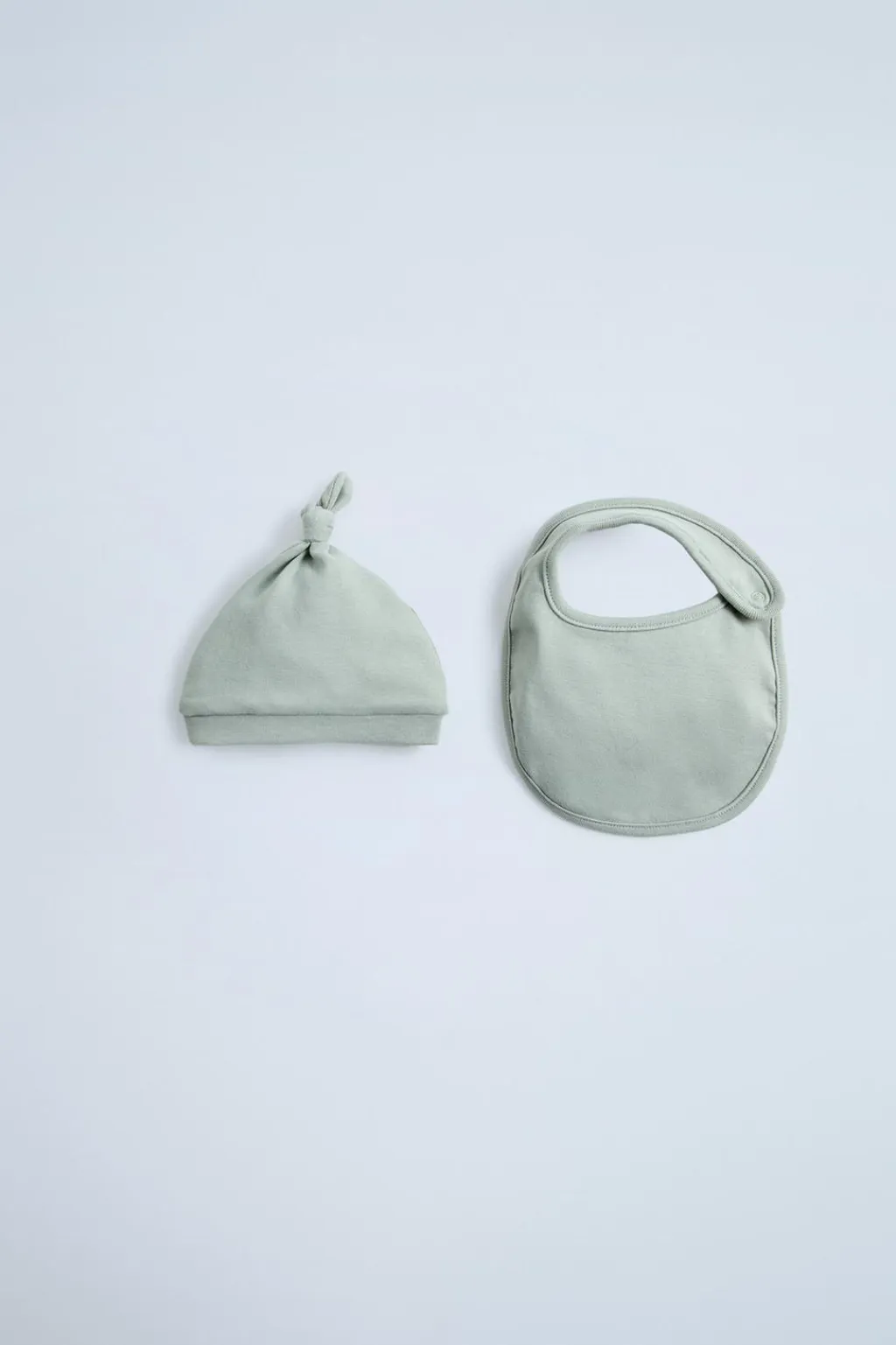 Pack de dos piezas. Gorro con detalle nudo en la parte superior. Babero con cierre ajustable con botones tipo snap.