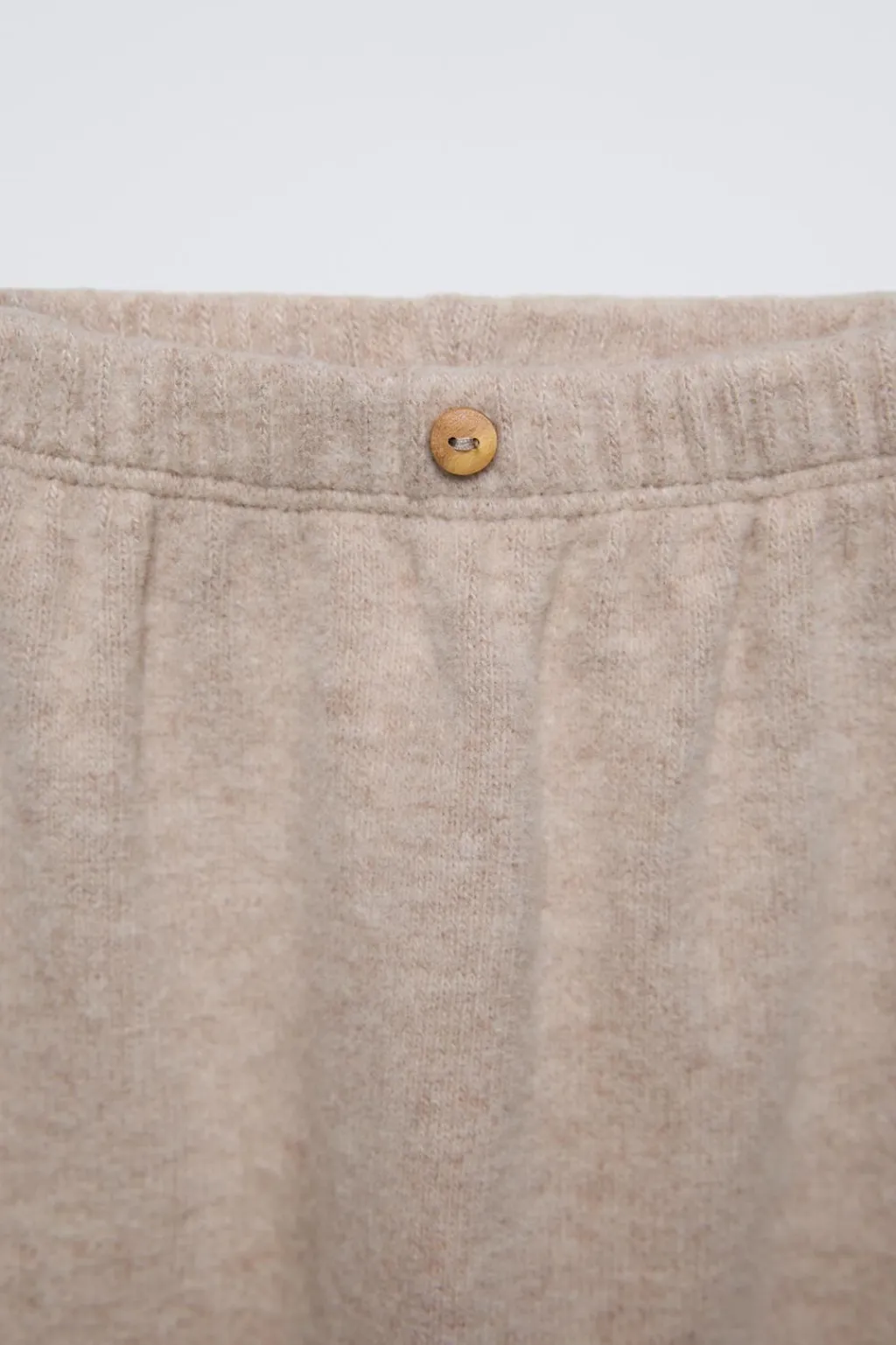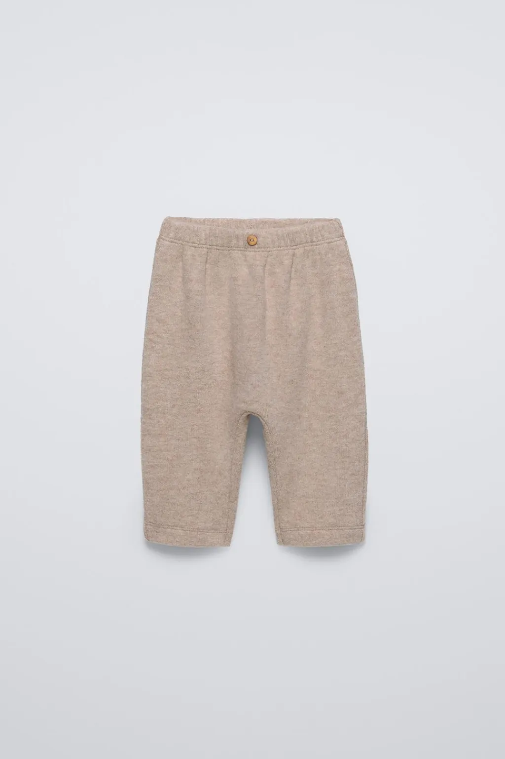 Pantalón liso con cinturilla elástica y aplique botón frontal.