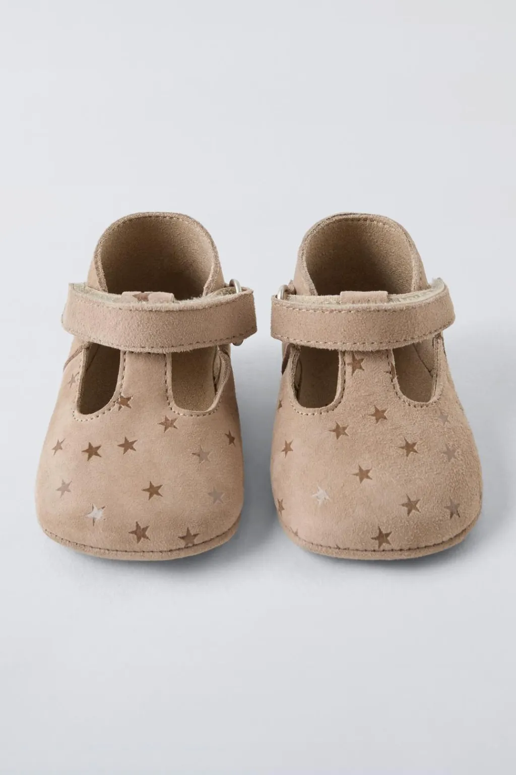 Zapato T tipo patuco 100% piel caprina con detalle estrellas. Cierre mediante tira adherente en el lateral. Plantilla flexible y suela 100% piel caprina.