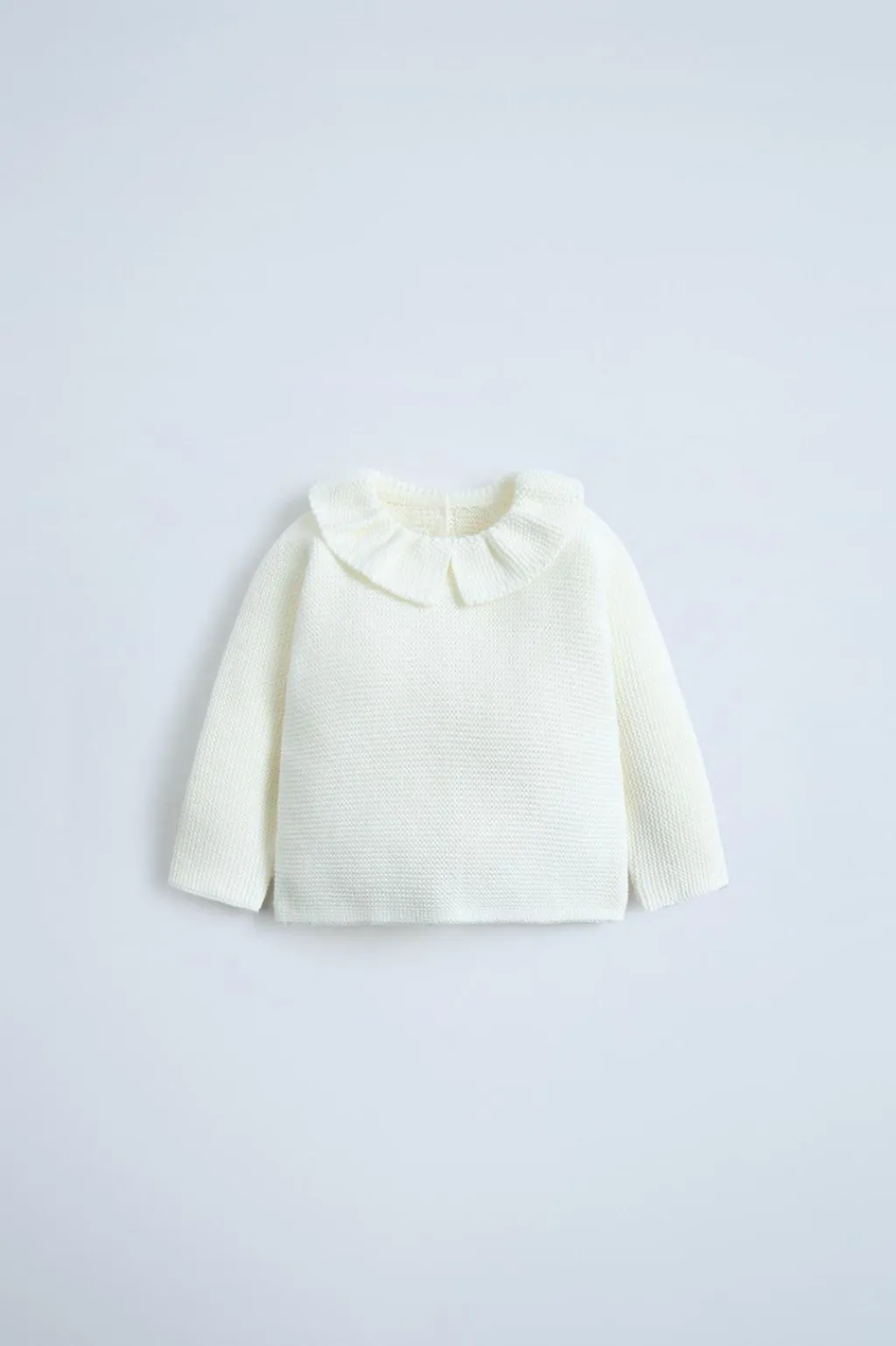 Jersey de punto con cuello redondo, aplique volante y manga larga. Cierre con botonadura en espalda.