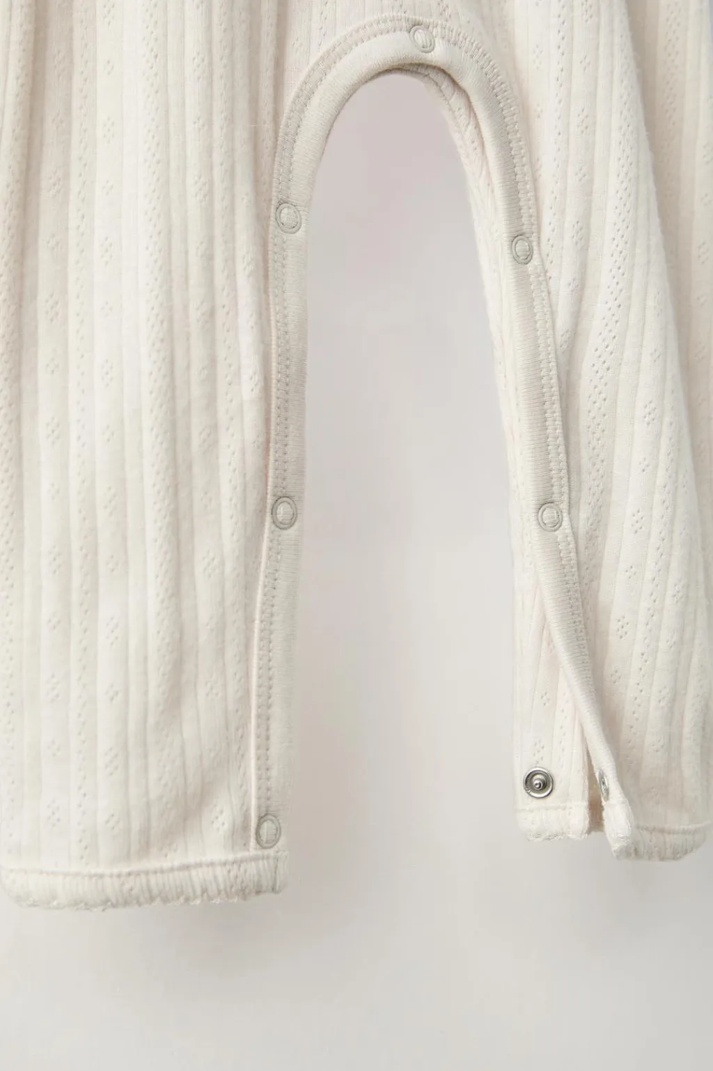 Mono de punto pointelle con cuello redondo y manga larga. Cierre con botonadura en canesú. Bajo con botones tipo presión.