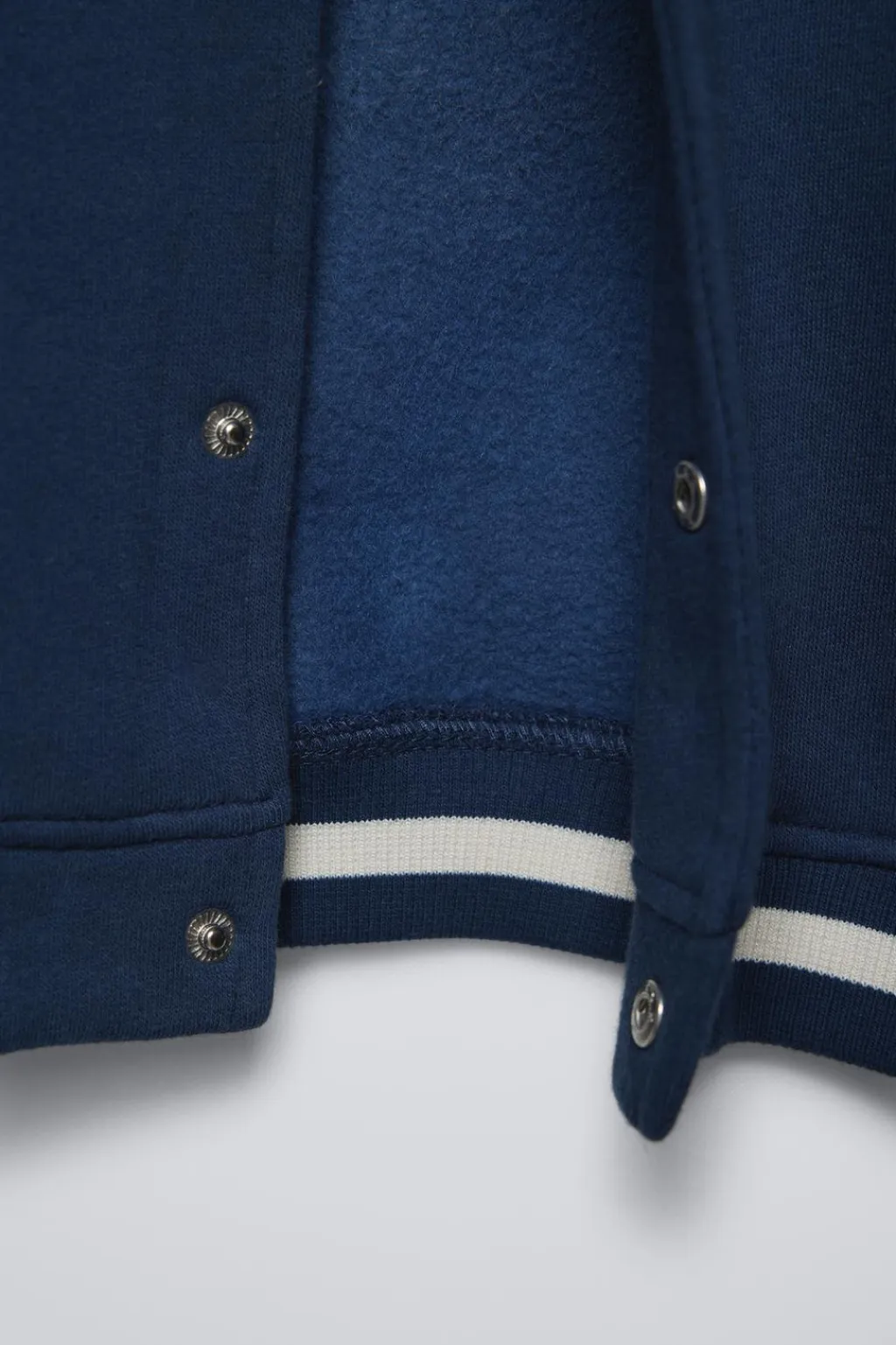 Bomber con cuello subido y manga larga. Acabados en rib. Cierre con botones tipo presión en delantero. Detalle bordado y estampado con relieve en pechera. Estampado texto en espalda y manga.