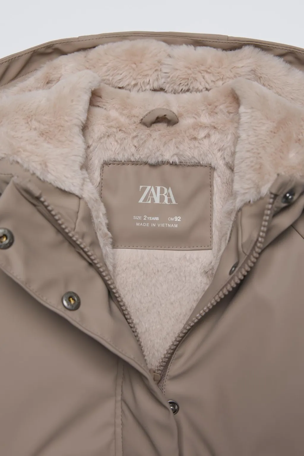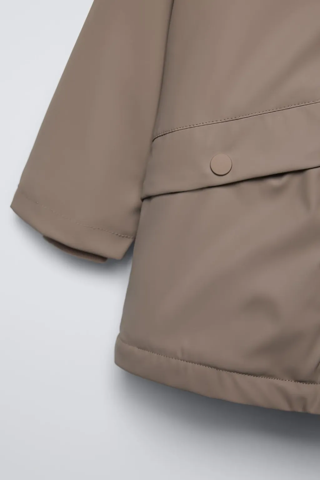 Chubasquero con capucha y manga larga con puño interior. Cierre con cremallera oculta por tapeta con botones tipo snap. Bolsillos en delantero con botones tipo snap. Forro en calidad efecto pelo en interior y capucha.
