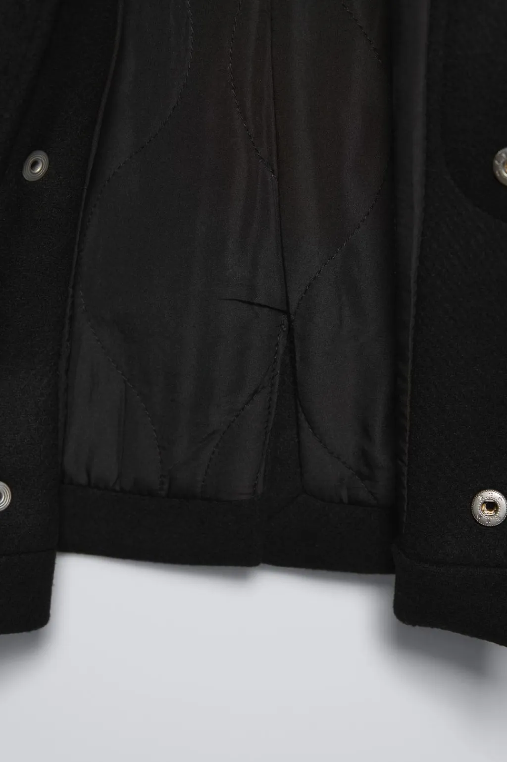 Abrigo acolchado con cuello camisero y manga larga con aplique. Cierre botonadura frontal oculta por solapa. Bolsillos delanteros con tapeta. Tejido con un 26% de lana.