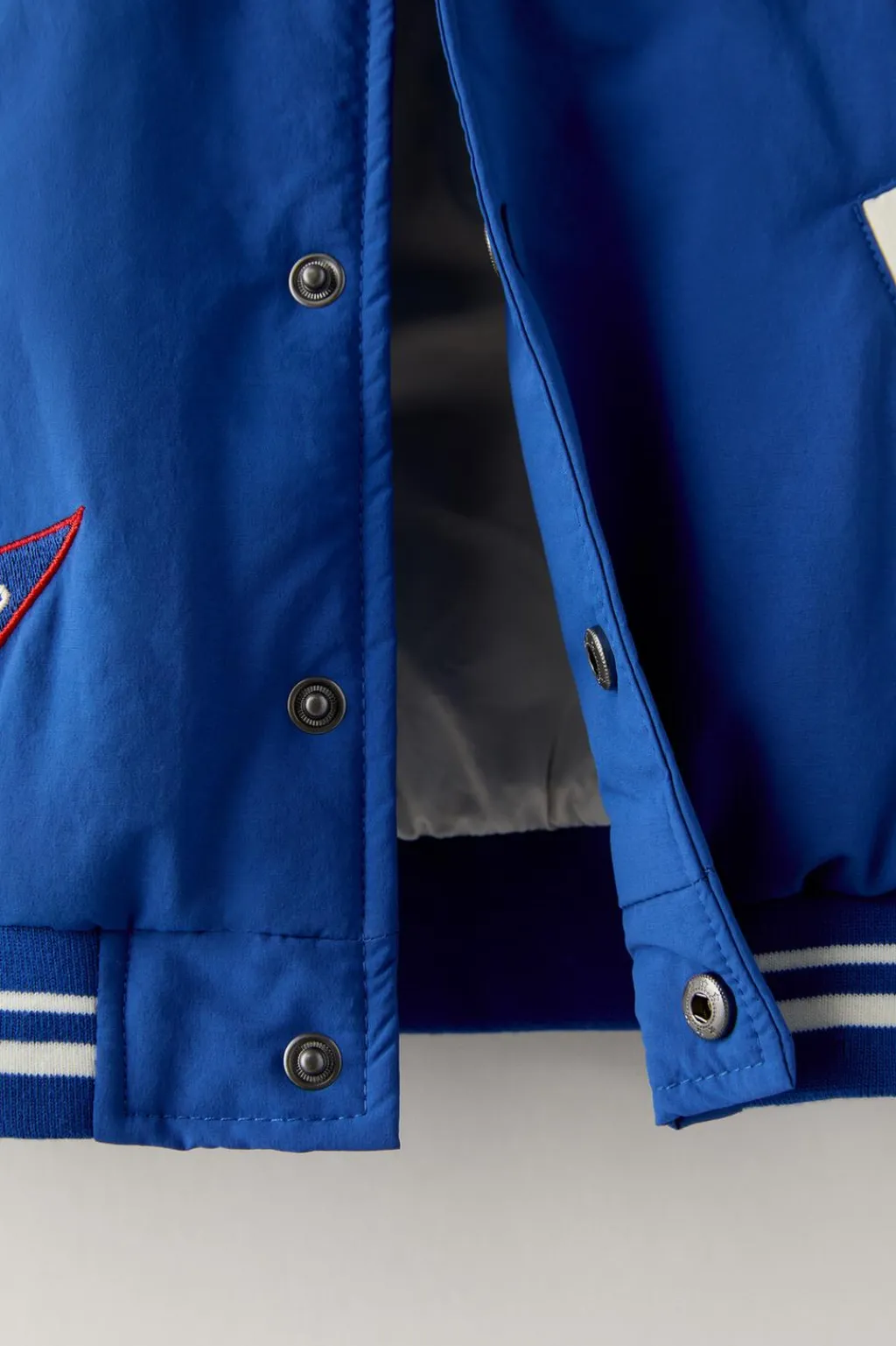 Bomber con cuello subido y manga larga. Cierre frontal con botones tipo presión. Detalle texto bordado en delantero y aplique parche en manga y espalda. Bolsillos en delantero. Acabados en rib.