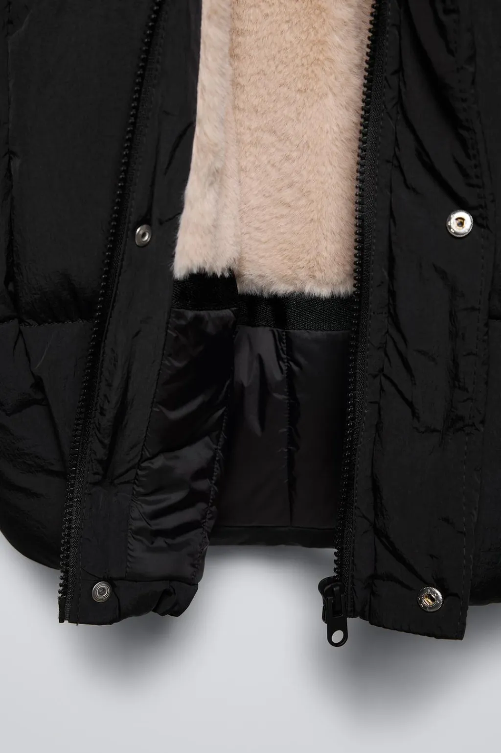 Plumífero con un tejido especial repelente al agua, relleno 50% pluma y 50% plumón. Con capucha y aplique pelo desmontable por botones tipo presión, cuello subido y manga larga acabada en puño interior. Cierre con cremallera oculta por tapeta con botones tipo presión. Bolsillos en delantero. Forro interior calidad suave.