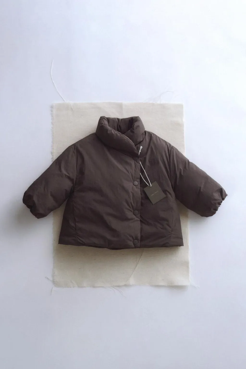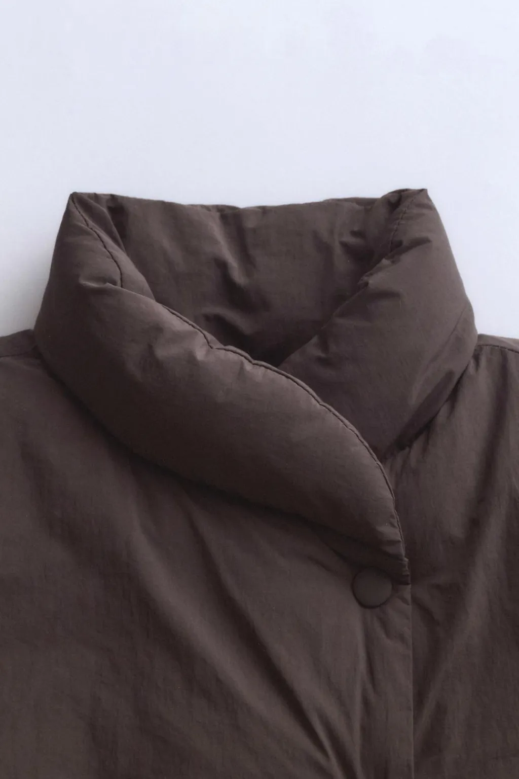 Cazadora acolchada confeccionada en tejido repelente al agua. El detalle está en el cierre cruzado con botones de color a tono. Los bolsillos están ocultos en una costura del delantero. Las mangas acaban en goma para mayor comodidad.