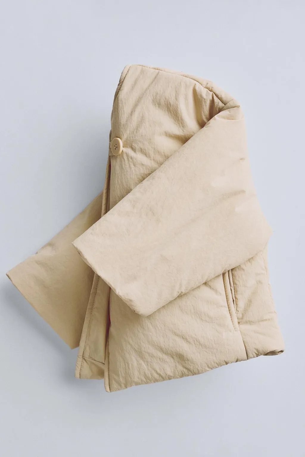 Cazadora acolchada con fit oversize y patrón tipo kimono. Tiene el cierre cruzado con botón en color a tono y otro oculto tipo presión. Los bolsillos son tipo vivo en el delantero.