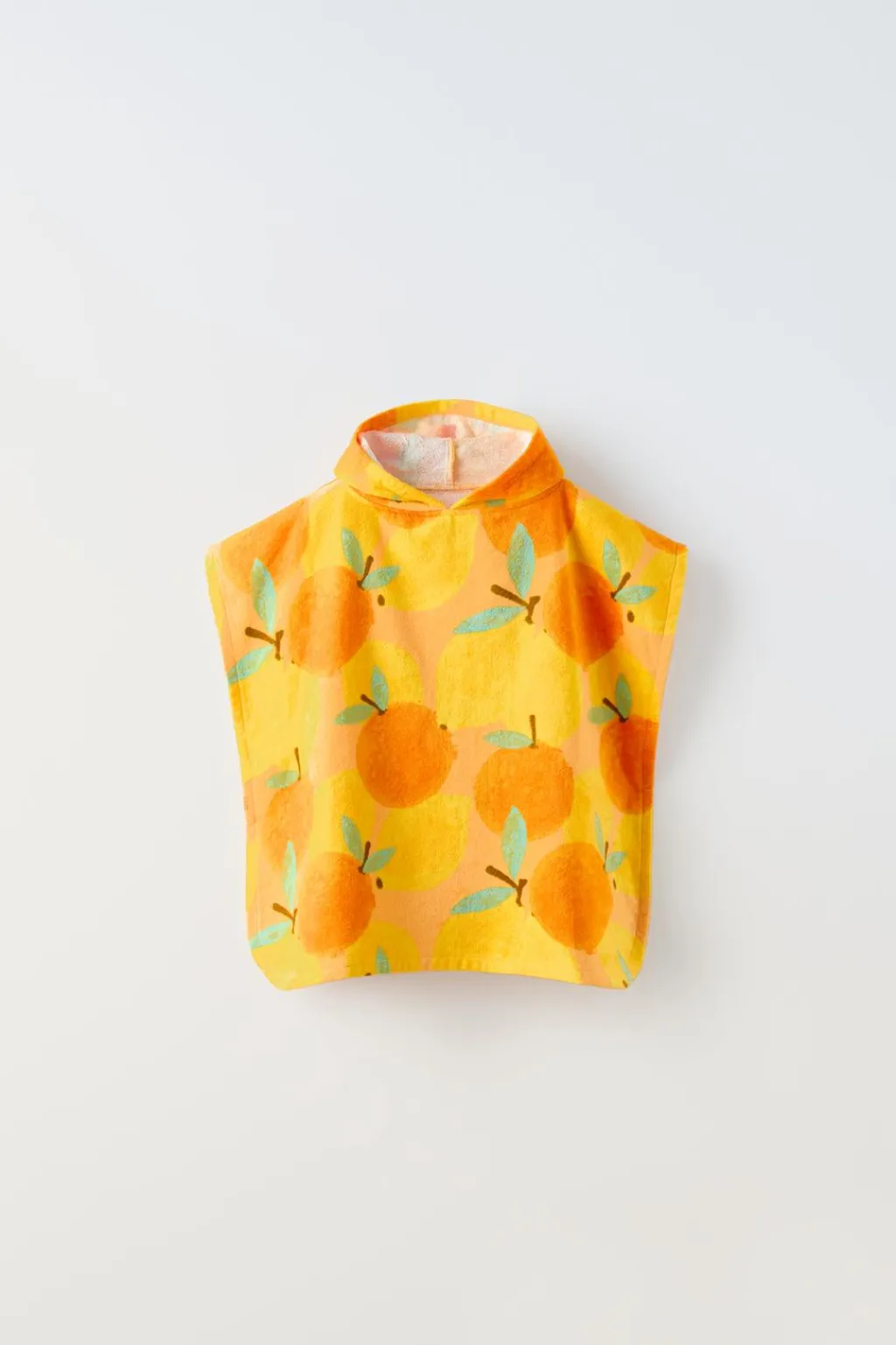 Poncho tipo toalla con capucha y estampado motivo frutas.