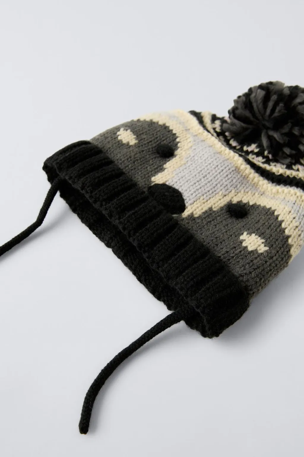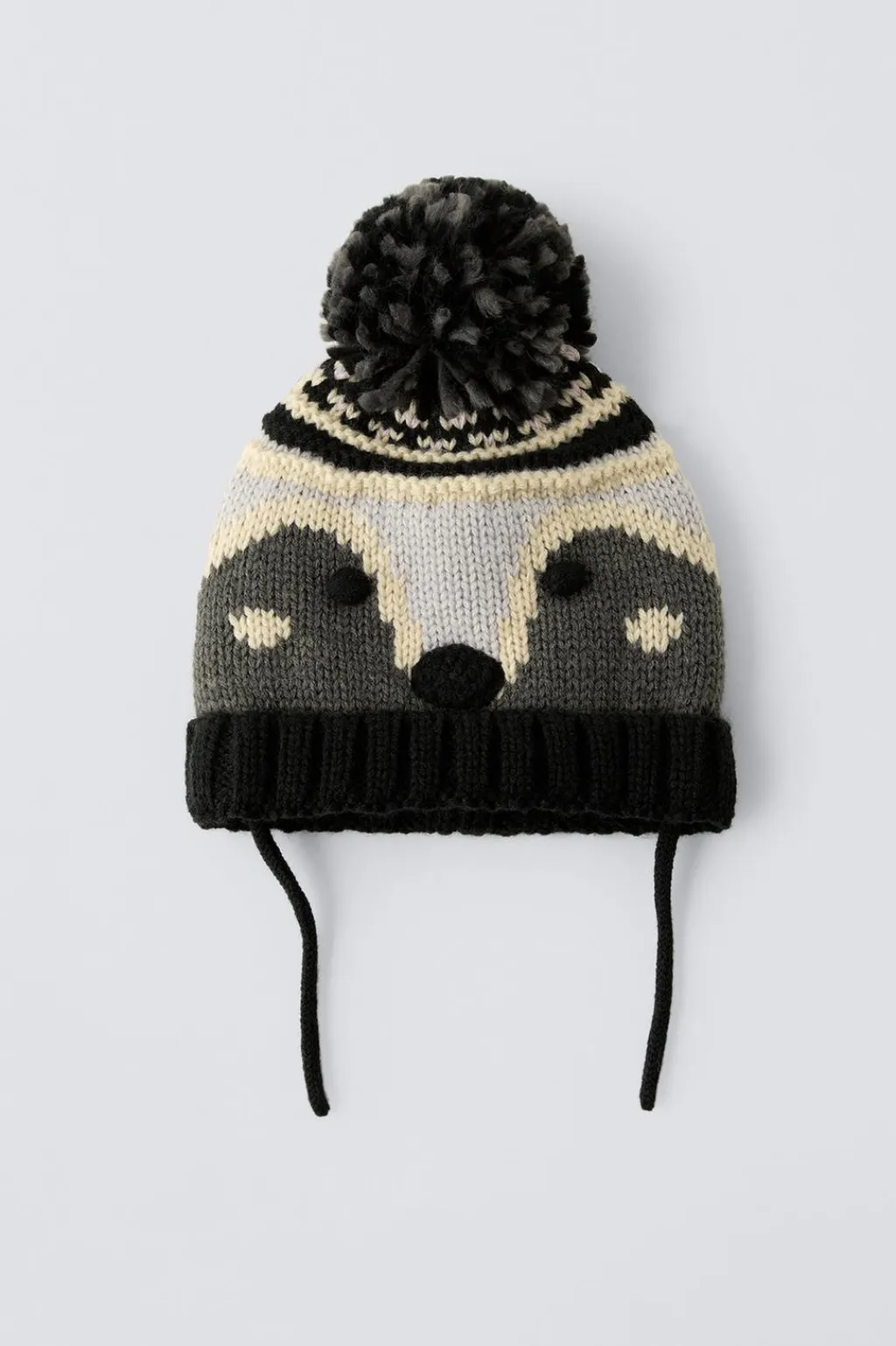 Gorro de punto con cordones ajustables y aplique pompón. Estampado zorrito.