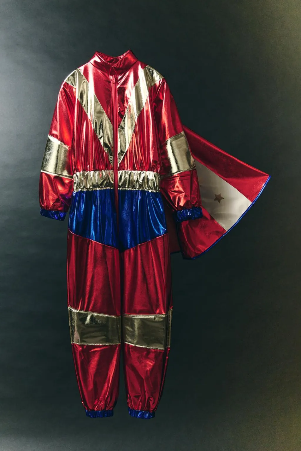 Disfraz con cuello subido y manga larga. Cierre con cremallera frontal. Aplique goma en cintura, puno y bajo. Aplique capa con adhesivo en espalda.