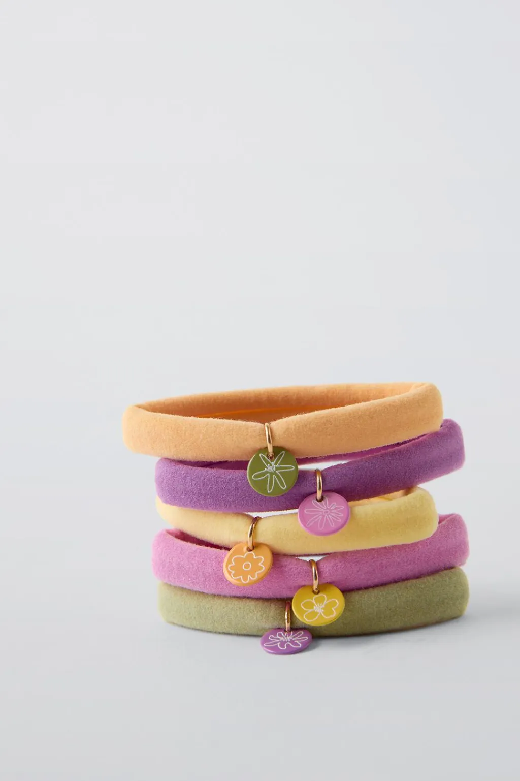 Pack de cinco gomas elásticas. Detalle plaquita con flor.