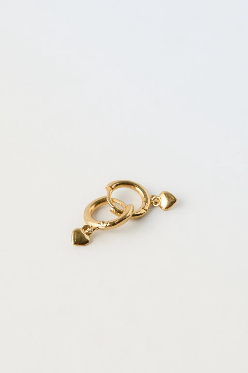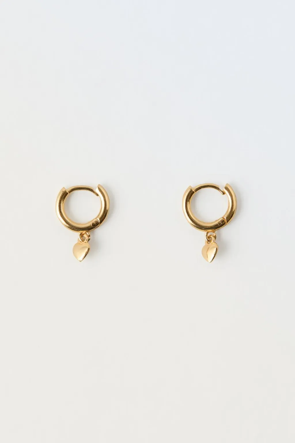 Pendientes de aro de 10mm de diámetro con un colgante en forma de corazón de 4.5mm de tamaño, cierre a presión. Chapado en oro de 0.50 micras y acabado baño de 24 kilates.