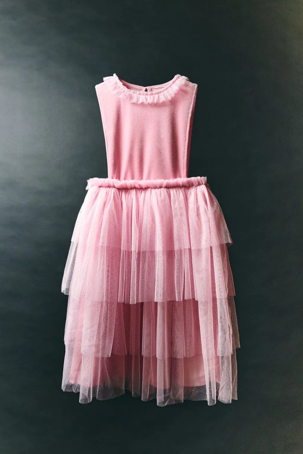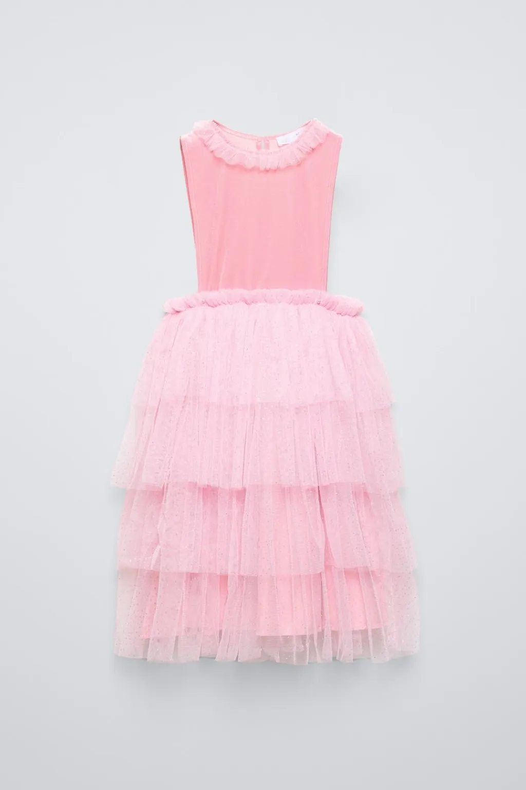 Vestido con cuello redondo y manga sisa. Cierre en lágrima con botón en espalda. Aplique volantes en bajo con detalle brillo.
