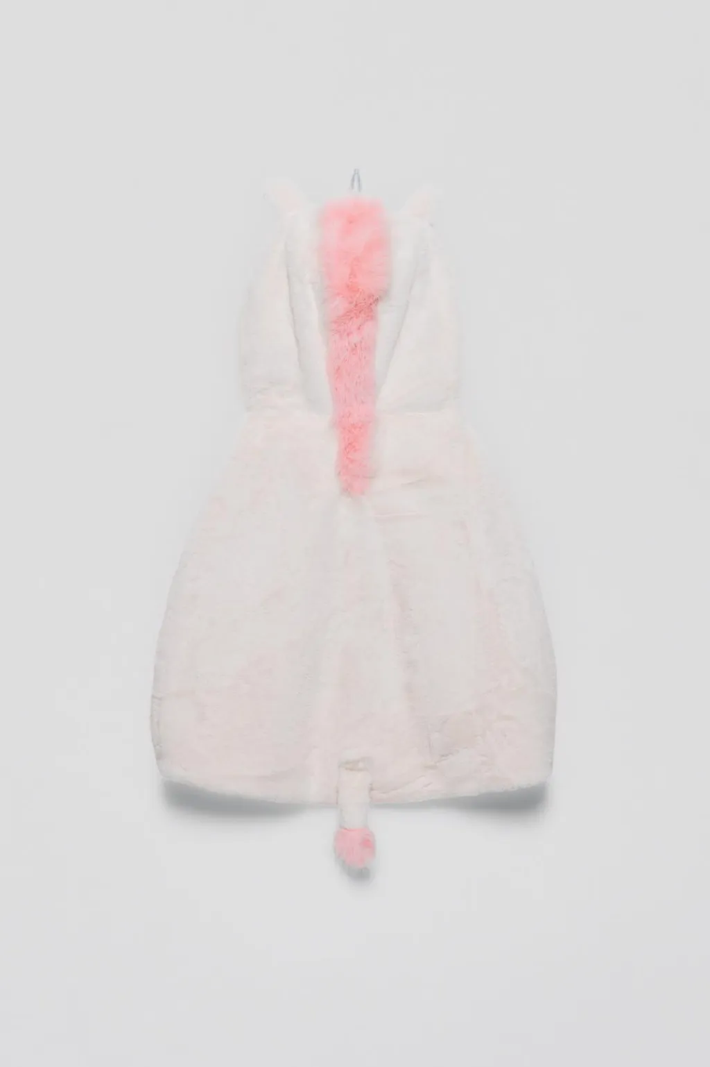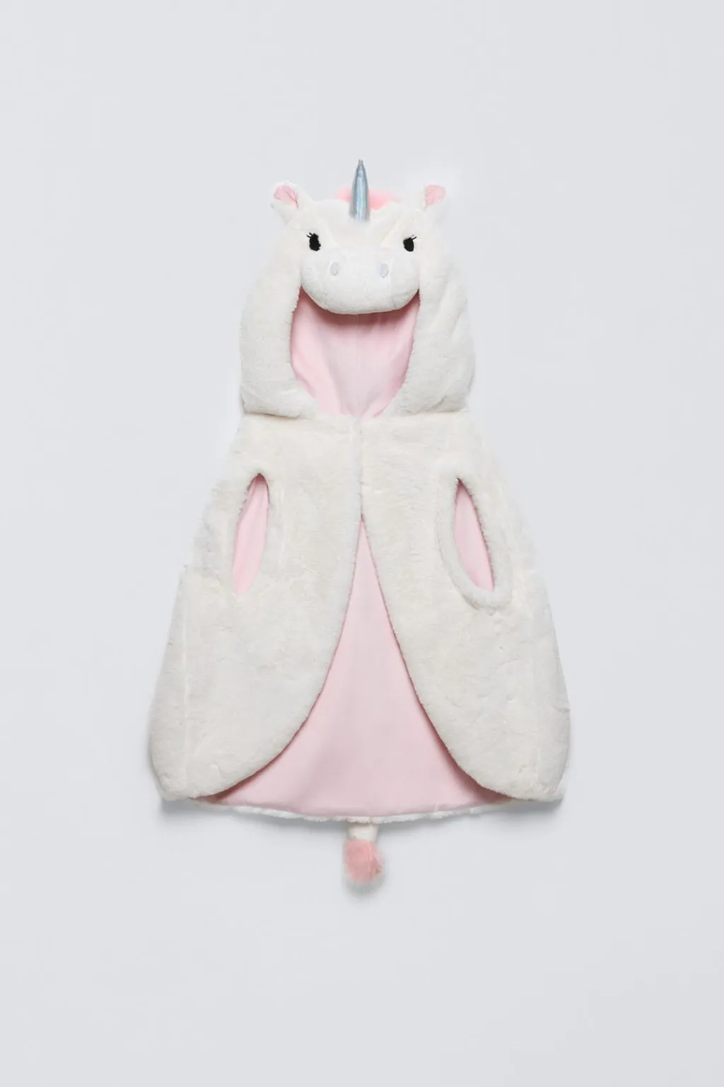 Capa efecto pelo con capucha de unicornio, manga corta y cierre adhesivo frontal. Aplique cola en espalda. Forro interior en tejido polar.