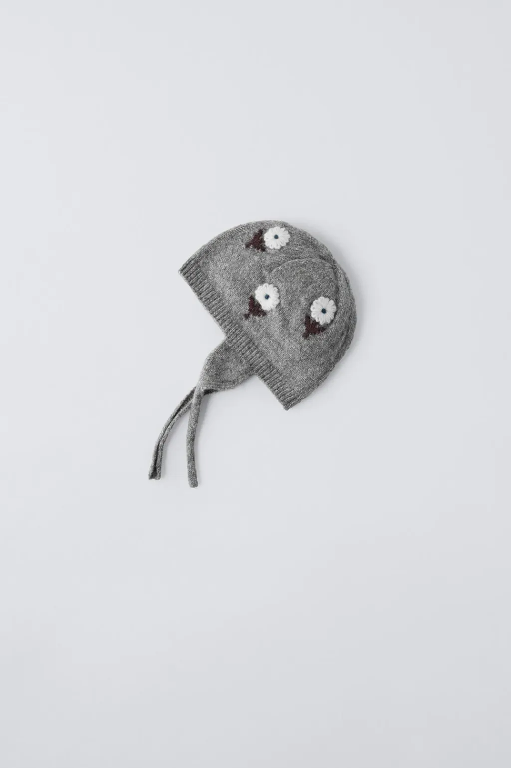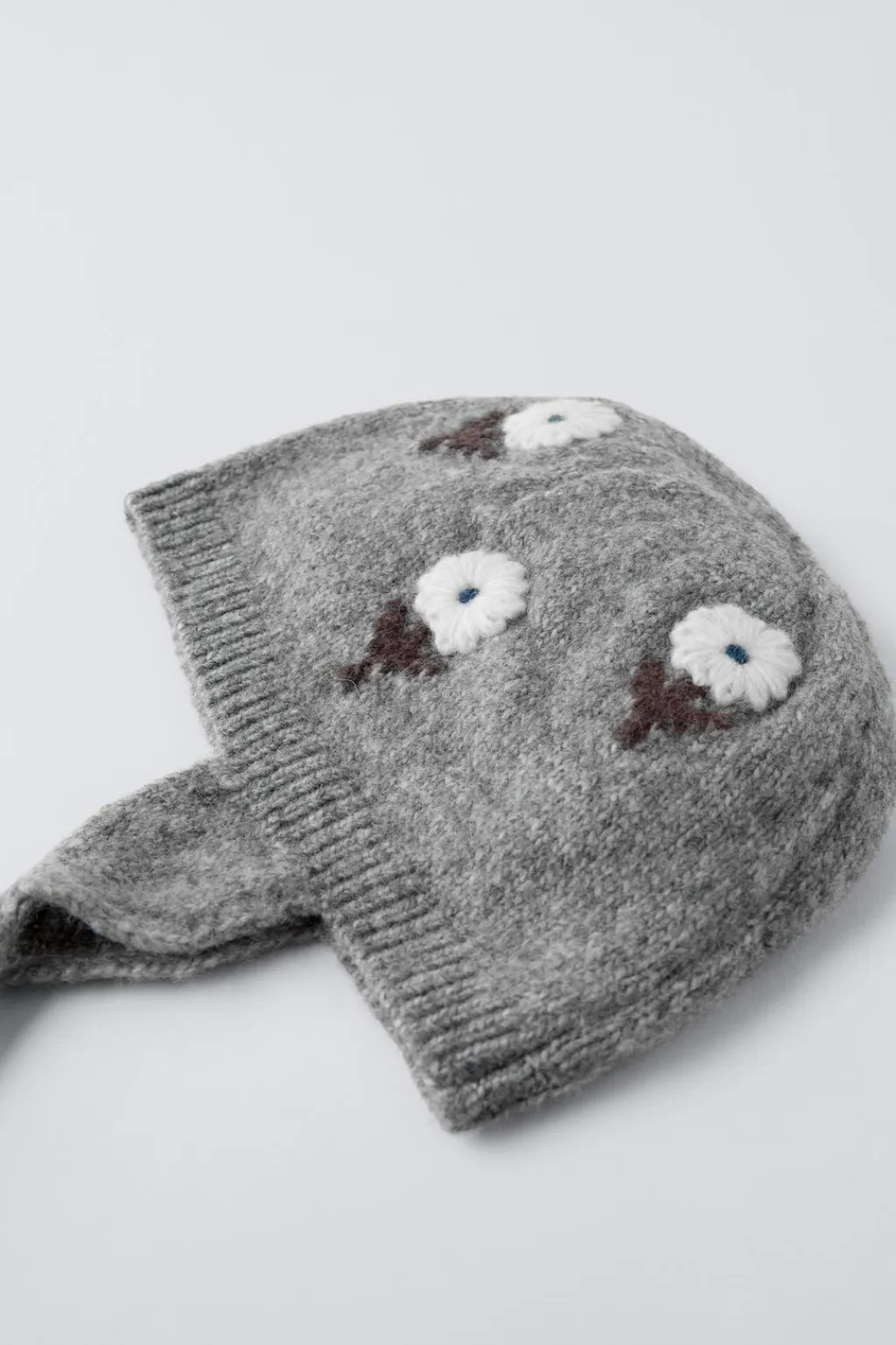 Capota de punto con cordones ajustables y orejeras. Detalle flores bordadas.