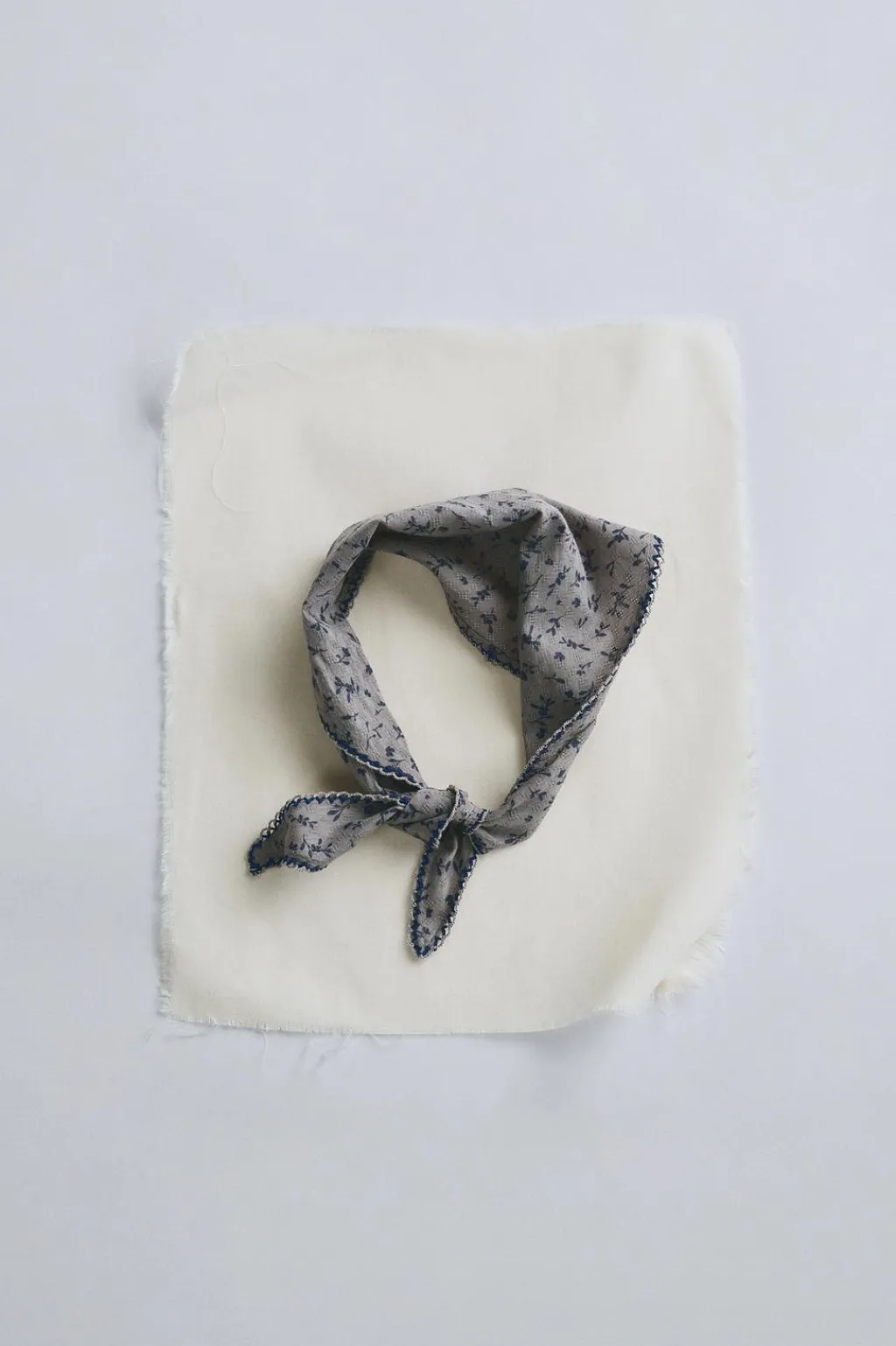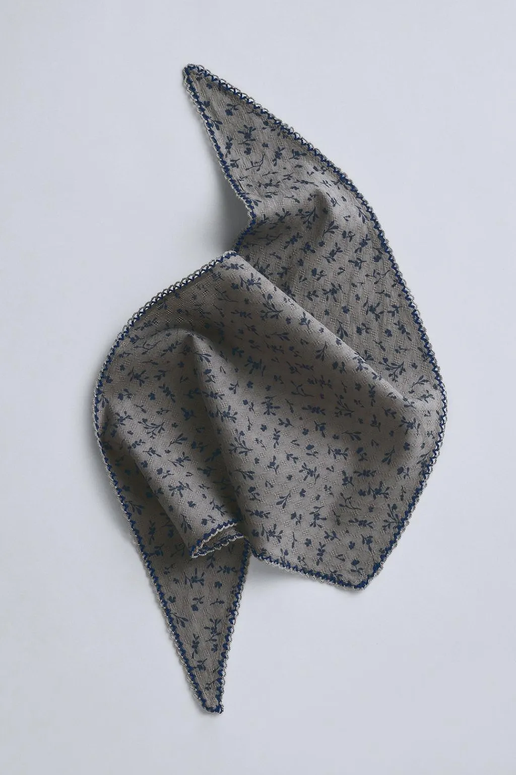 Pañoleta confeccionada en tejido de algodón estampado. Tiene forma triangular y pespunte en acabados.
