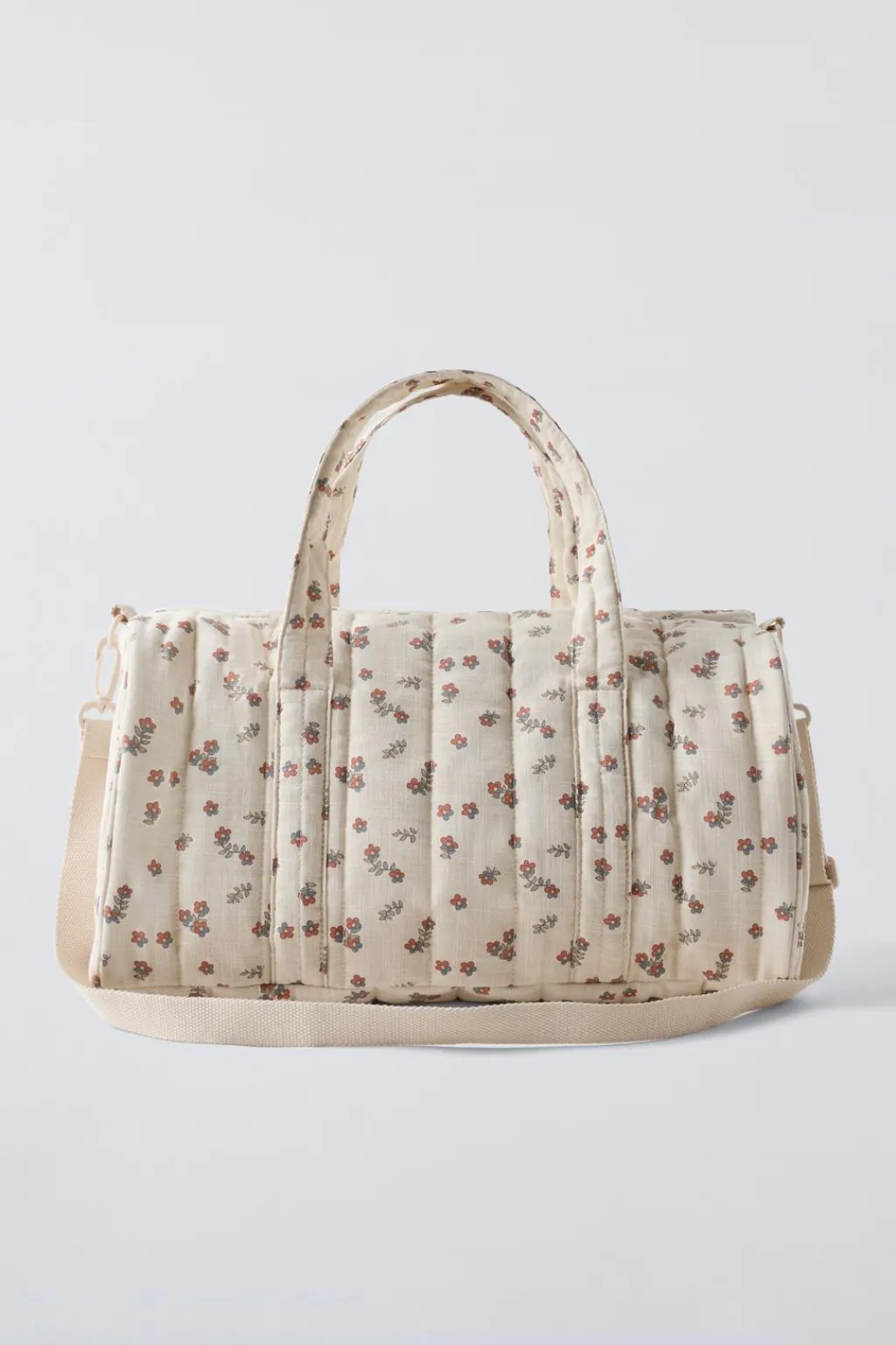 Bolsa de maternidad con estampado de flores. Compartimento principal con cierre mediante cremallera. En su interior cuenta con dos bolsillos sin cierre. En la parte frontal cuenta con un bolsillo con cierre mediante cremallera. Doble asa de mano y asa de hombro ajustable y extraíble.
