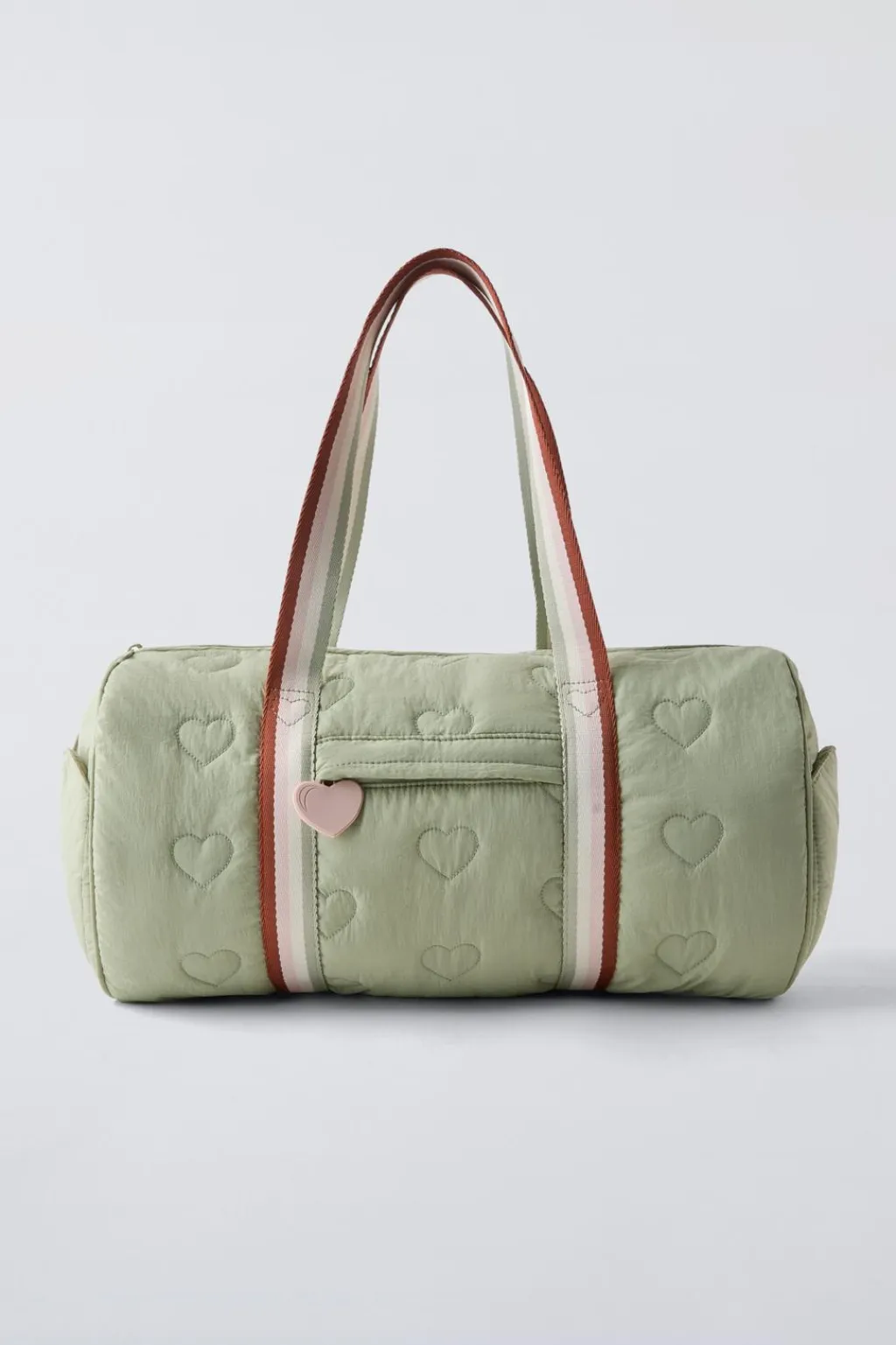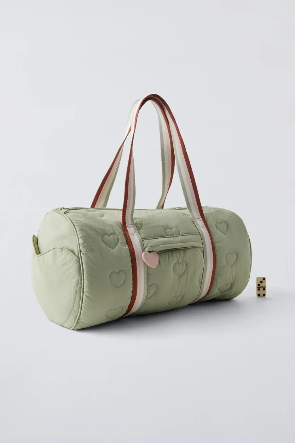 Bolso tipo bowling con detalle corazones. Compartimento principal con cierre mediante cremallera. Cuenta con un bolsillo frontal con cierre mediante cremallera y dos bolsillos laterales en forma de corazón sin cierre. Doble asa de mano.