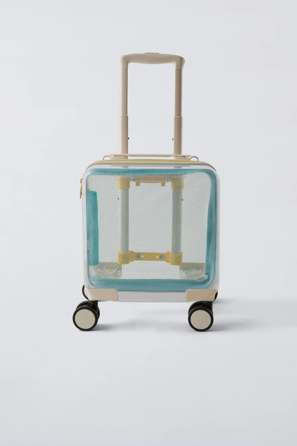 Maleta de viaje transparente. Cierre mediante cremalleras. Tirador extensible con dos alturas y asa de hombro extraíble. Cuatro dobles ruedas giratorias. Compartimento interior separado por redecilla con cierre mediante cremallera.