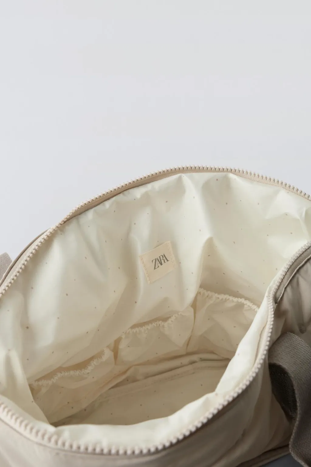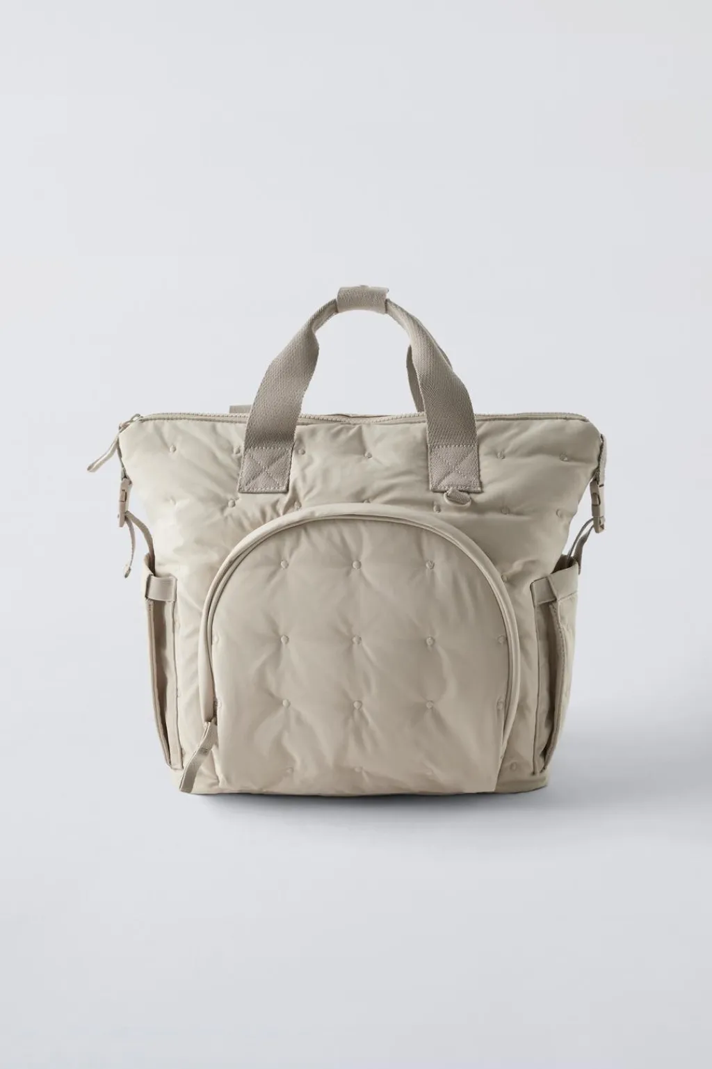 Bolso formato mochila de maternidad acolchada. Compartimento principal con cierre mediante cremallera. Cuenta con un bolsillo frontal con cierre mediante cremallera y dos bolsillos laterales sin cierre. En su interior, tiene compartimentos sin cierre. Cuenta con dos tiras adherentes para la sujeción en el carro. Doble asa de mano y asa de hombros ajustables.