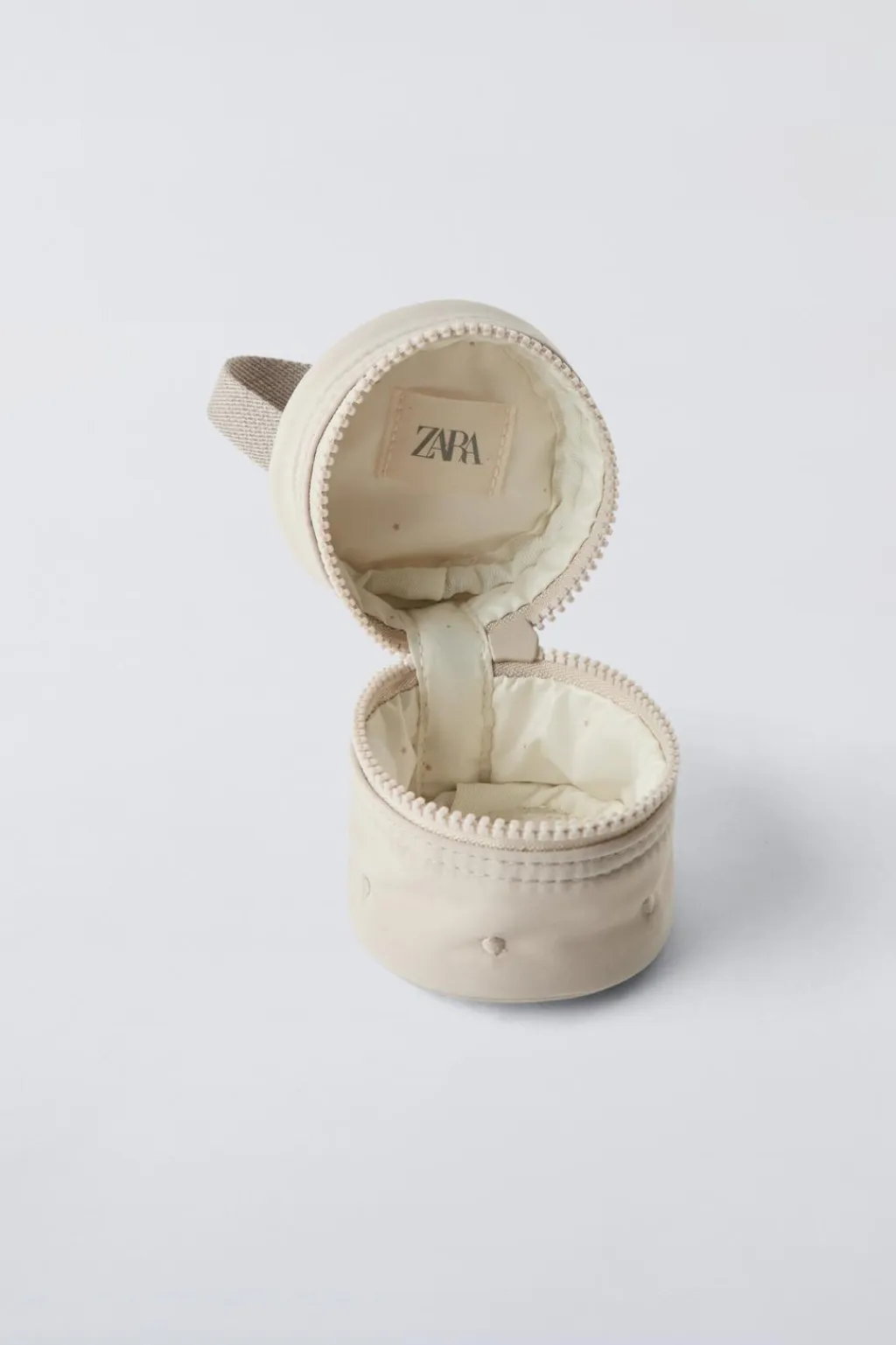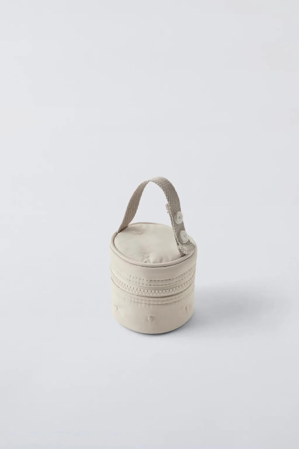 Funda para chupetes con cierre mediante cremallera. Asa de mano con broche para poder colgar.