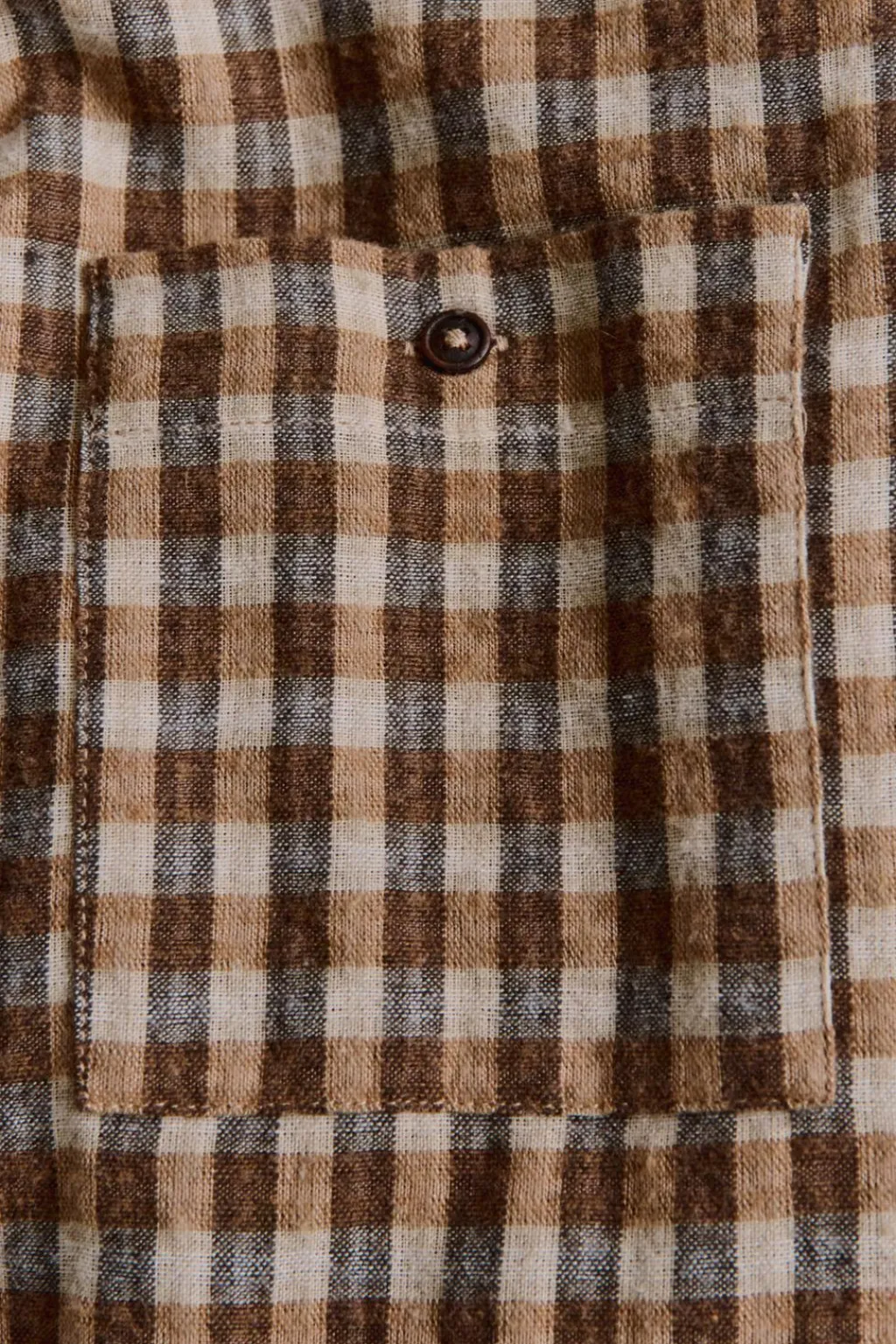 Camisa confeccionada en tejido con algodón y un patrón ancho. Los botones del cierre tienen acabado efecto madera. El detalle está en el bolsillo de la pechera con cierre de botón.