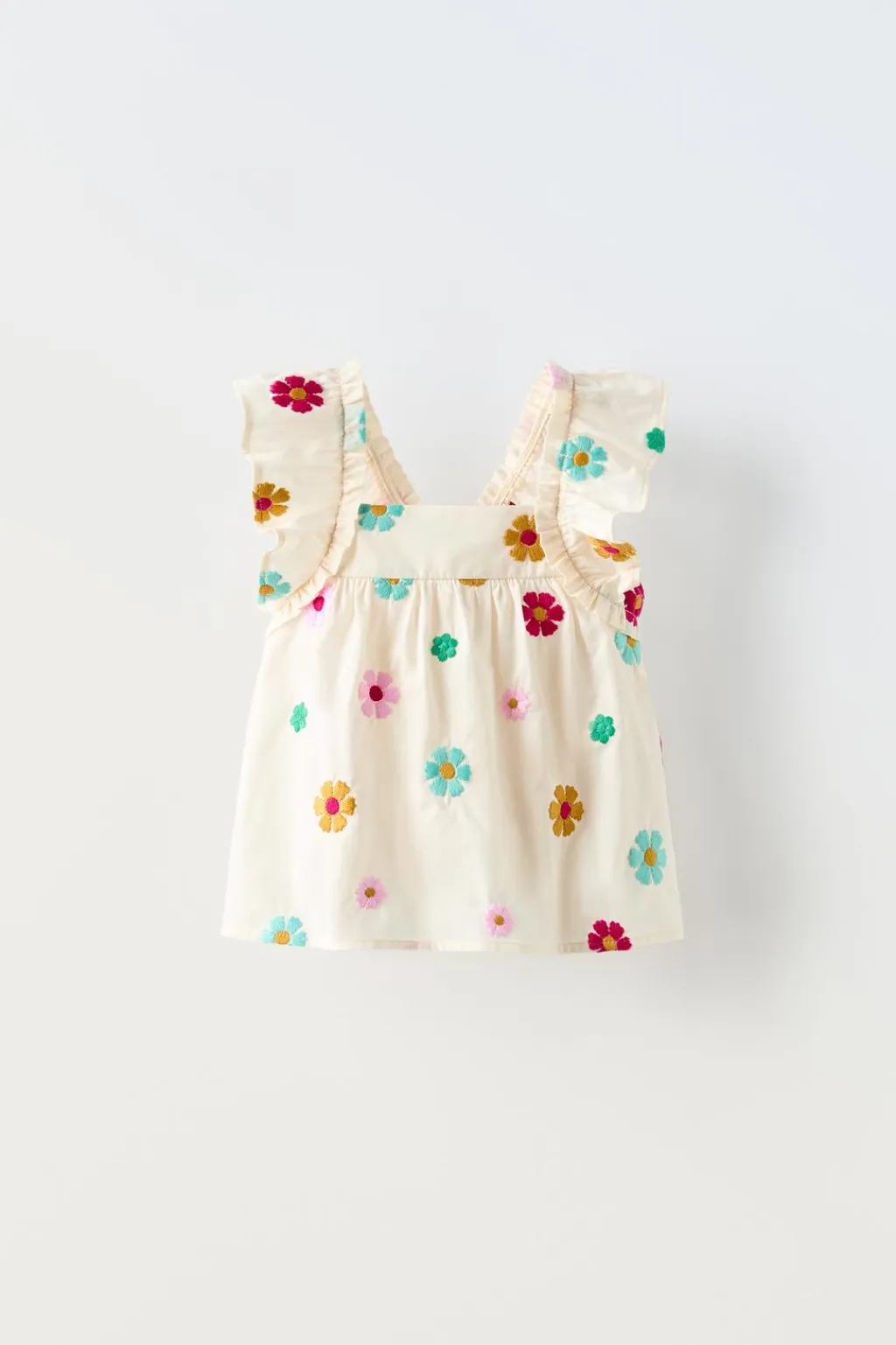 Camisa con cuello recto y tirantes con aplique volantes. Detalle goma en espalda. Motivo flores bordado all over.