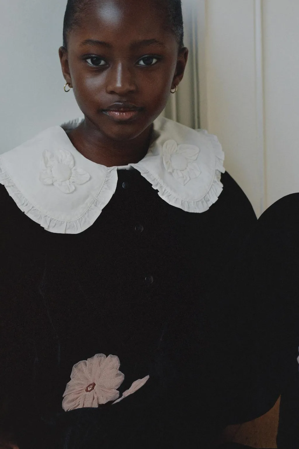 Camisa con cuello bobo y manga larga acabada en goma. Cierre botonadura frontal. Aplique flores en delantero.