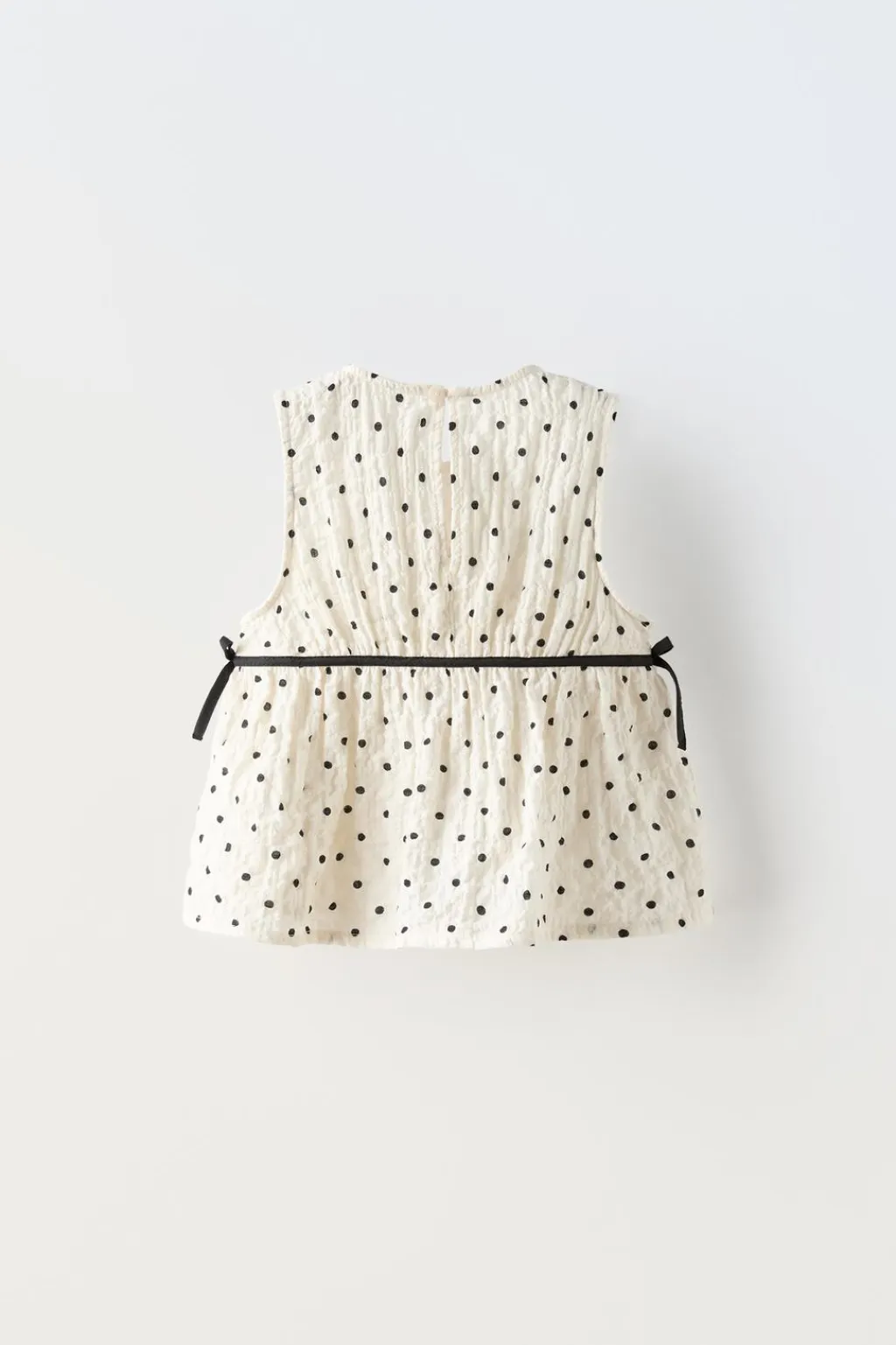 Camisa con cuello redondo y manga sisa. Detalle vivo color a contraste en delantero y aplique lazos en laterales. Cierre tipo lágrima con botón en espalda.