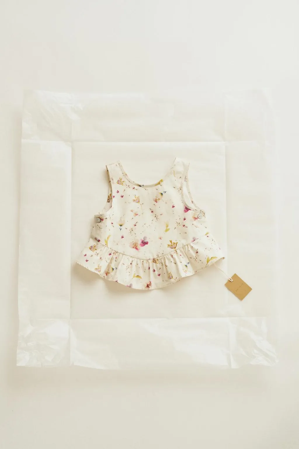 Top de popelín con estampado de flores. Tiene cierres laterales con botones nacarados y un volante en forma de U.