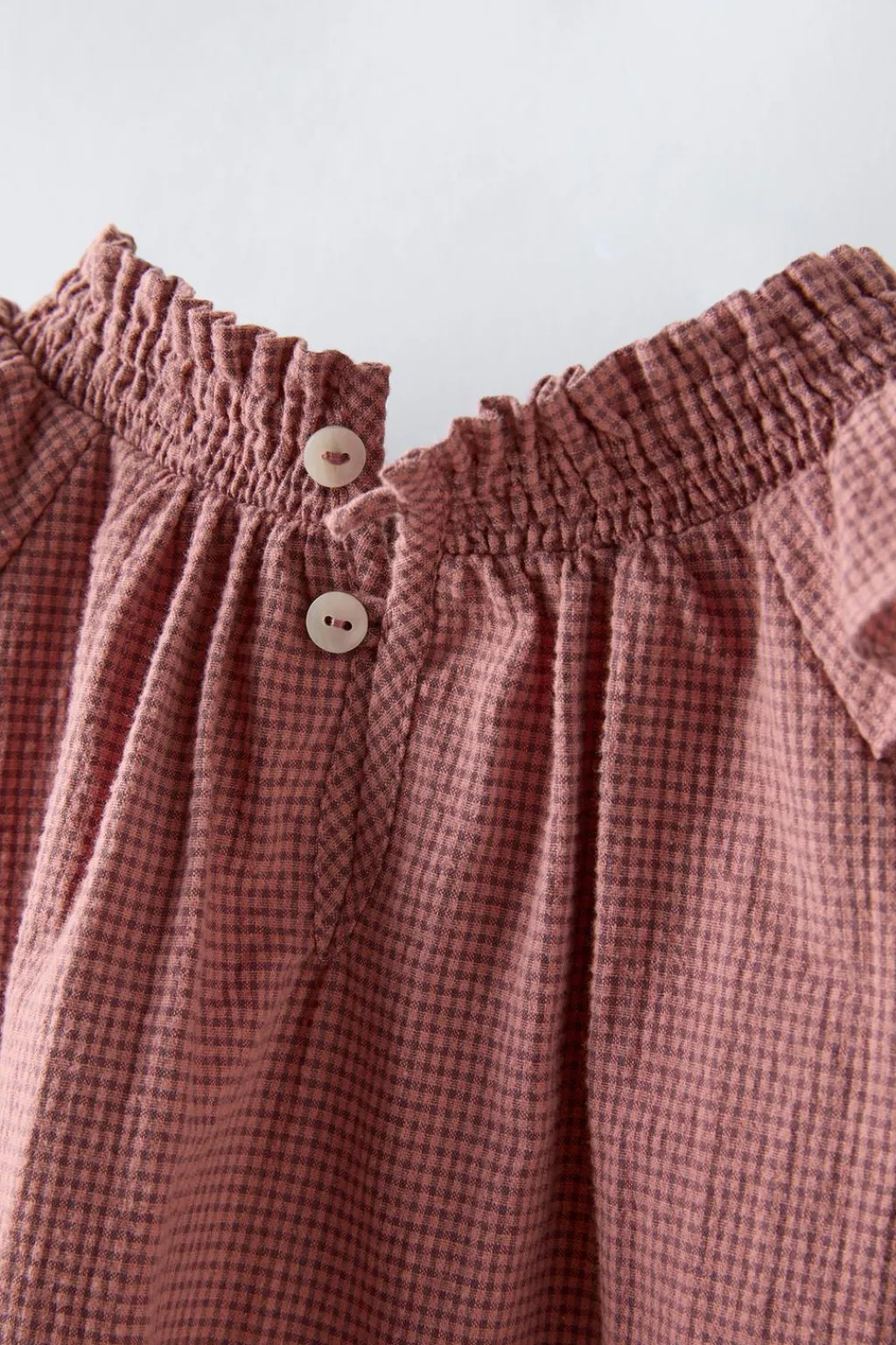 Camisa con cuello redondo y manga larga acabada en goma. Aplique volantes en cuello y hombros. Cierre con botonadura en espalda.