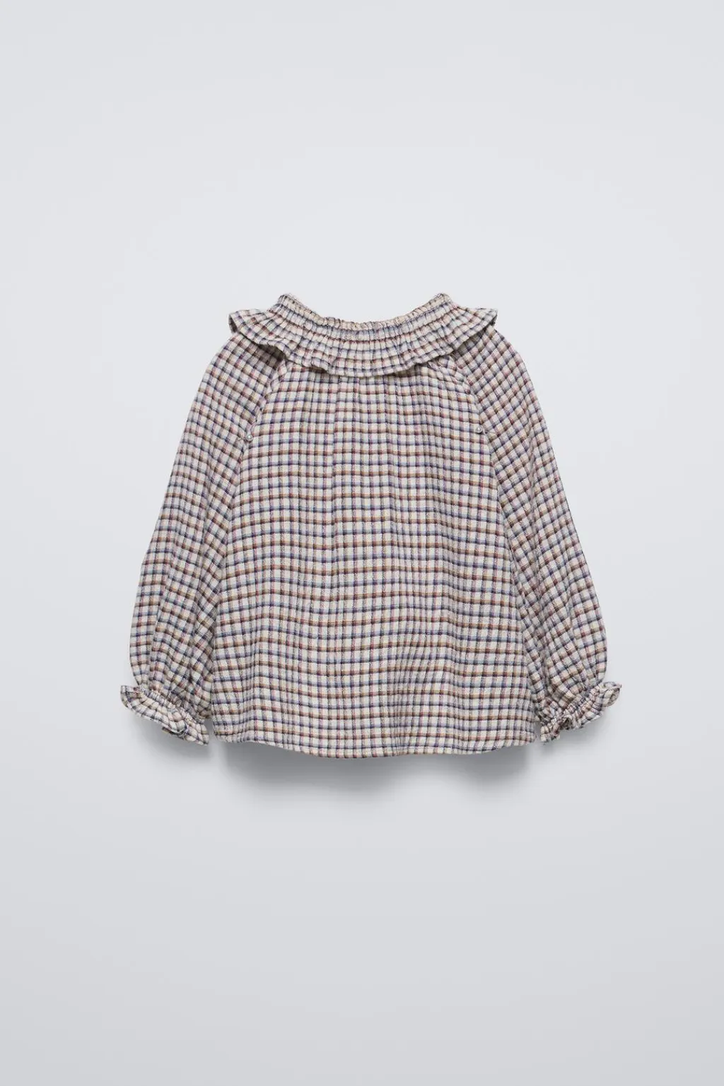 Camisa con cuello redondo, aplique volantes y manga larga acabada en goma. Cierre botonadura frontal.