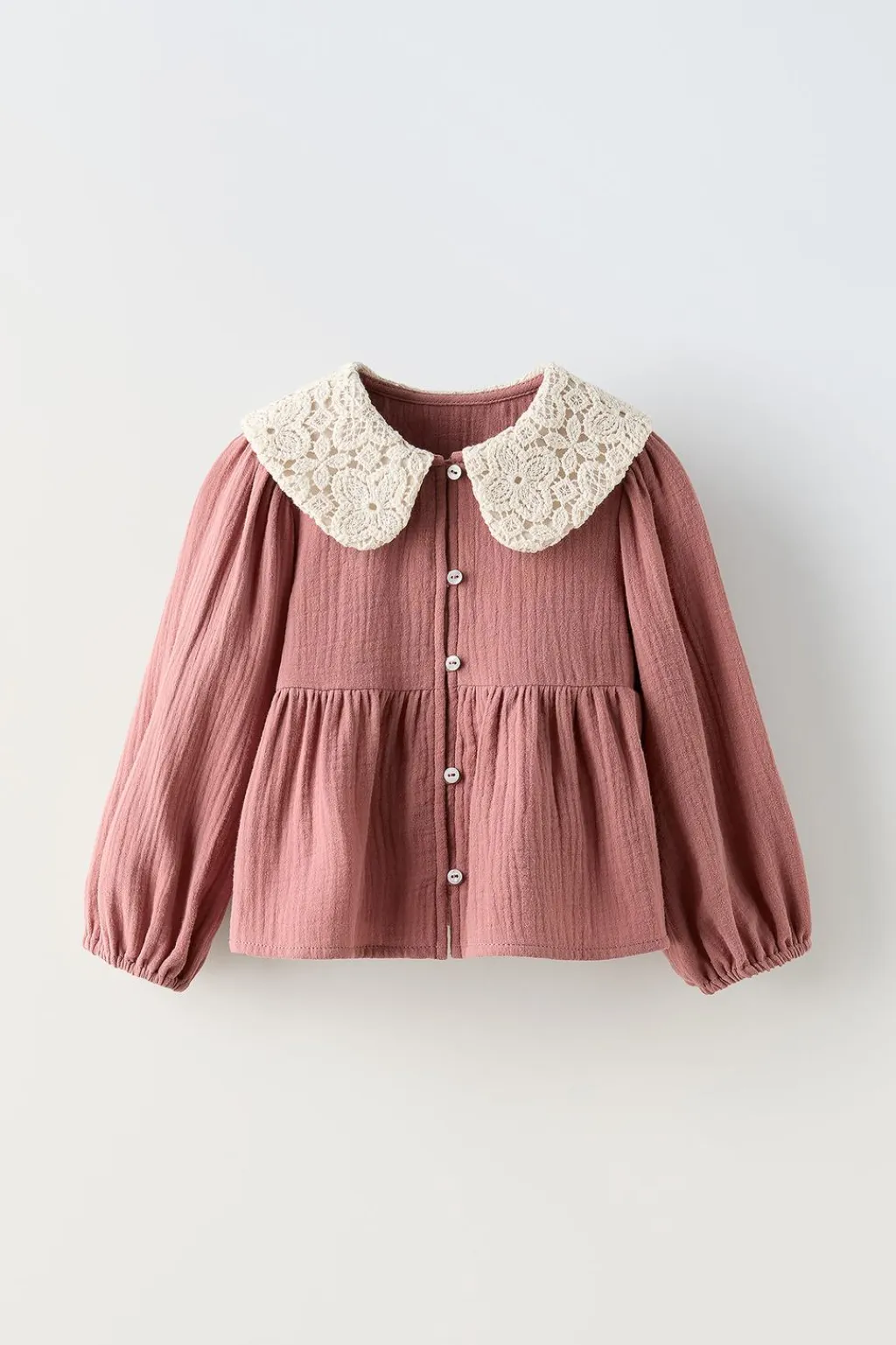 Camisa con cuello bobo combinado en crochet y manga larga acabado goma. Cierre con botonadura frontal. Detalle volante en el bajo.