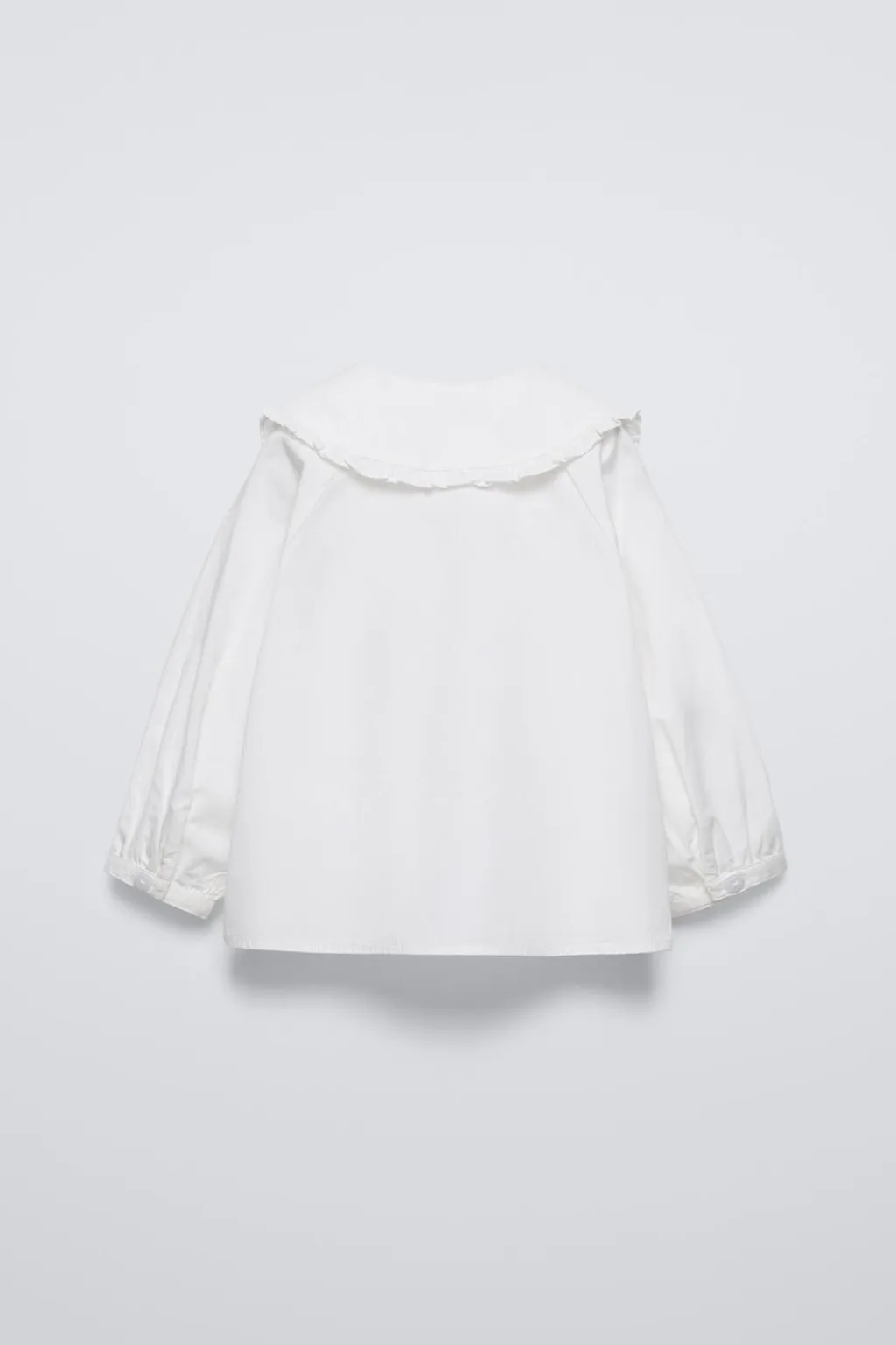 Camisa con cuello bobo y manga larga. Cierre botonadura frontal. Aplique flores y detalle volantes en cuello.