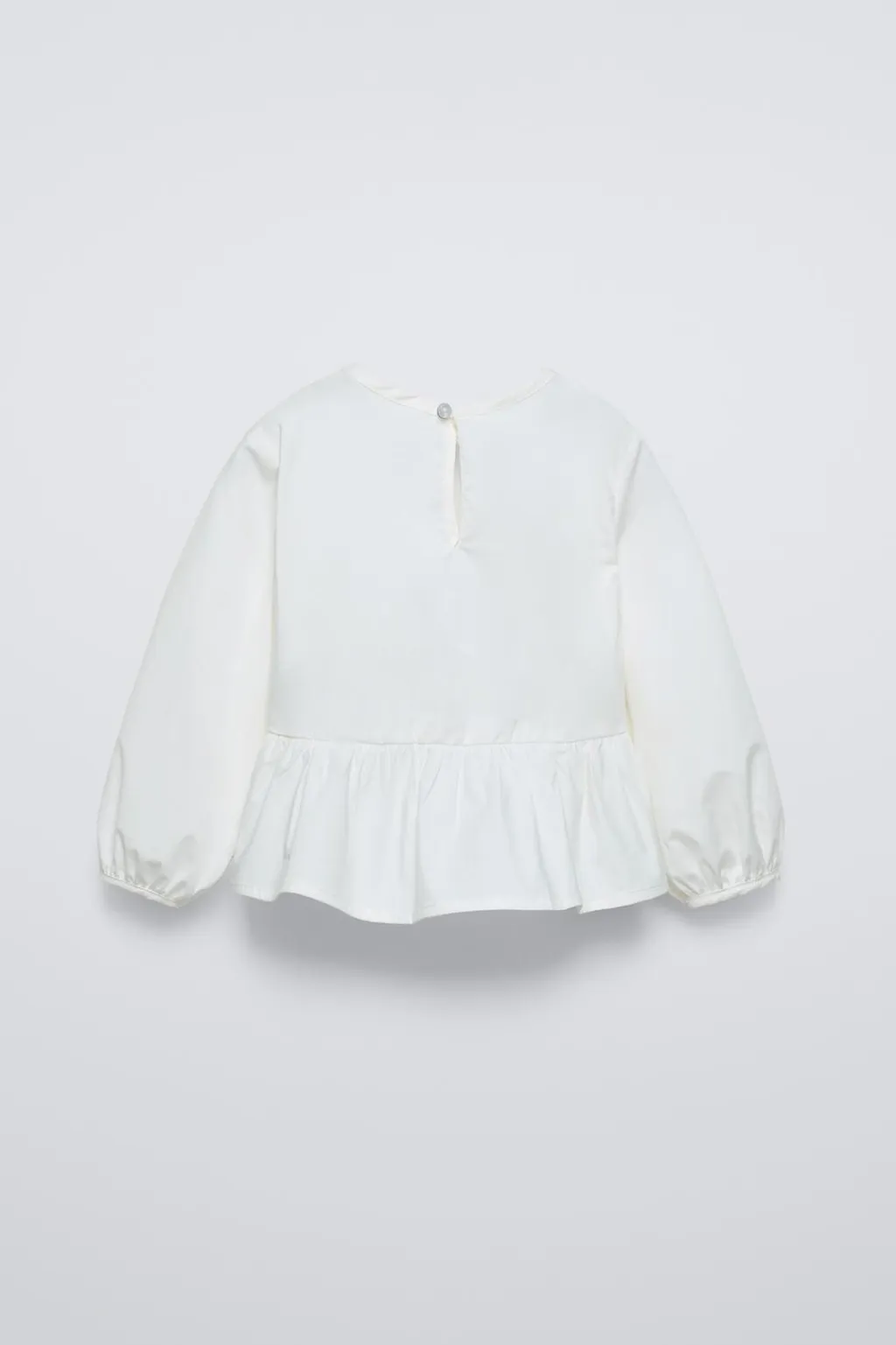 Camisa con cuello redondo y manga larga. Cierre tipo lágrima con botón en espalda. Aplique lazos frontal a contraste. Bajo acabado en volante.