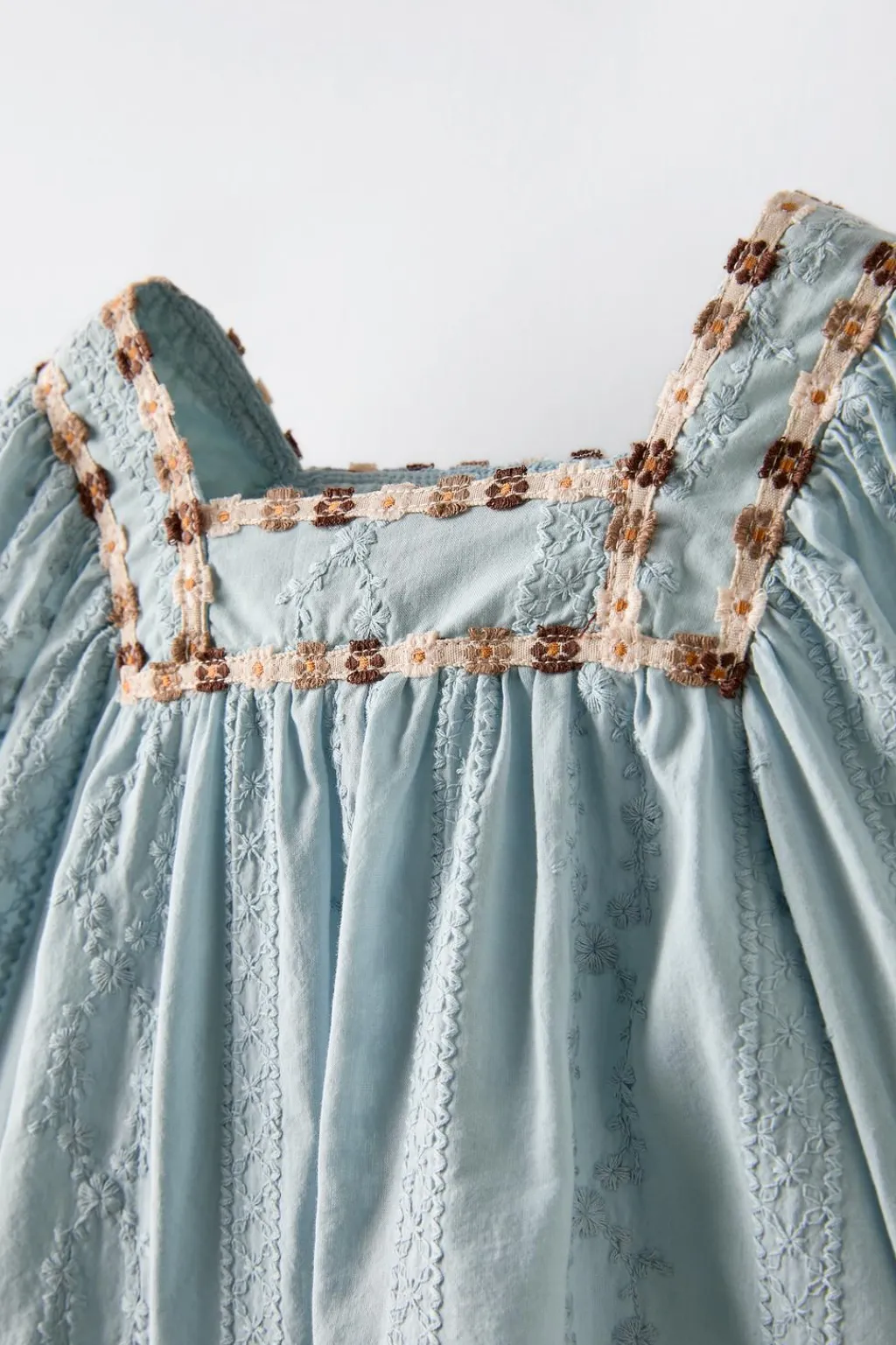 Camisa con cuello recto y manga larga acabada en goma. Detalle vivos con flores bordadas.