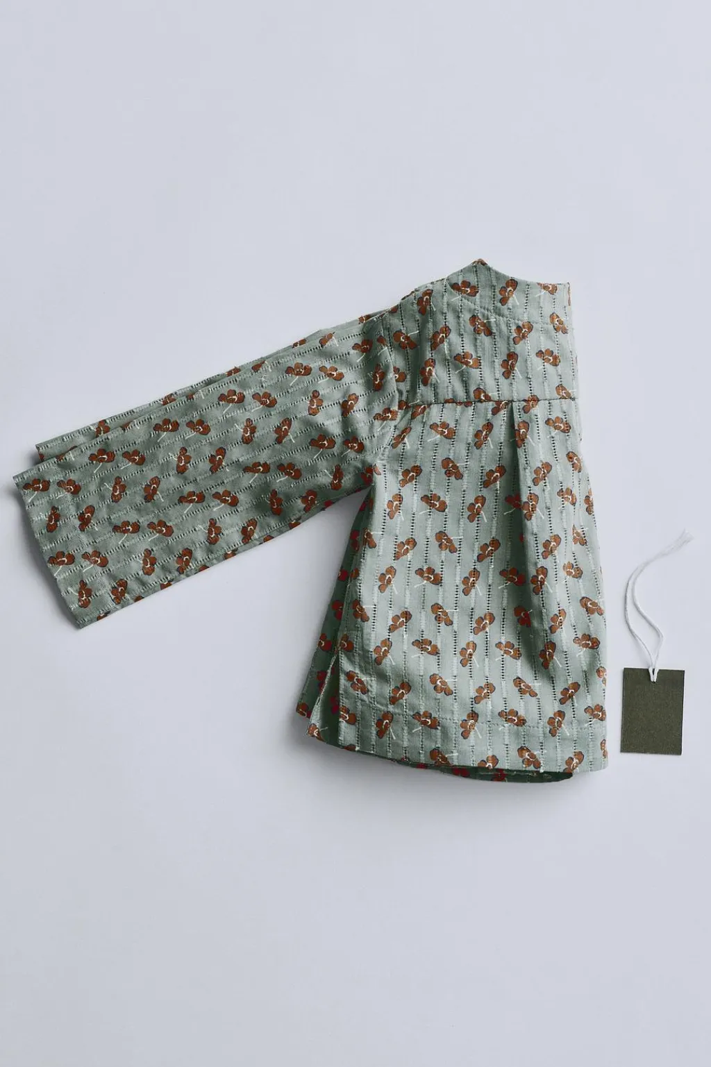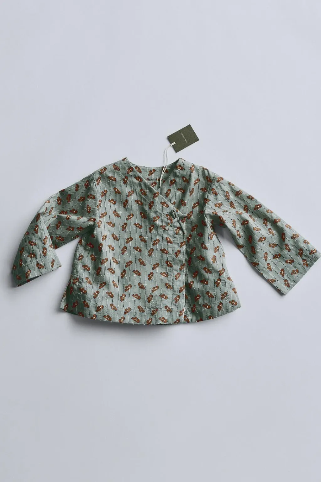 Blusa confeccionada en tejido de algodón estampado con detalles calados. Tiene el cierre cruzado tipo kimono con botones ocultos. Como detalle tiene fuelle en el canesú de la espalda.