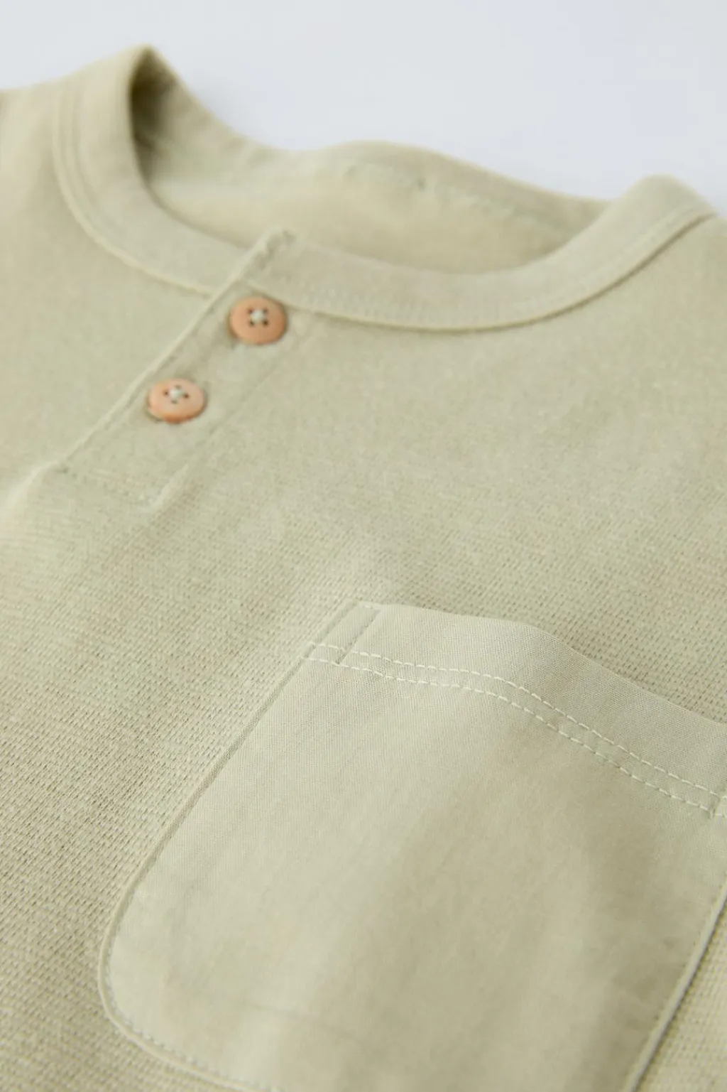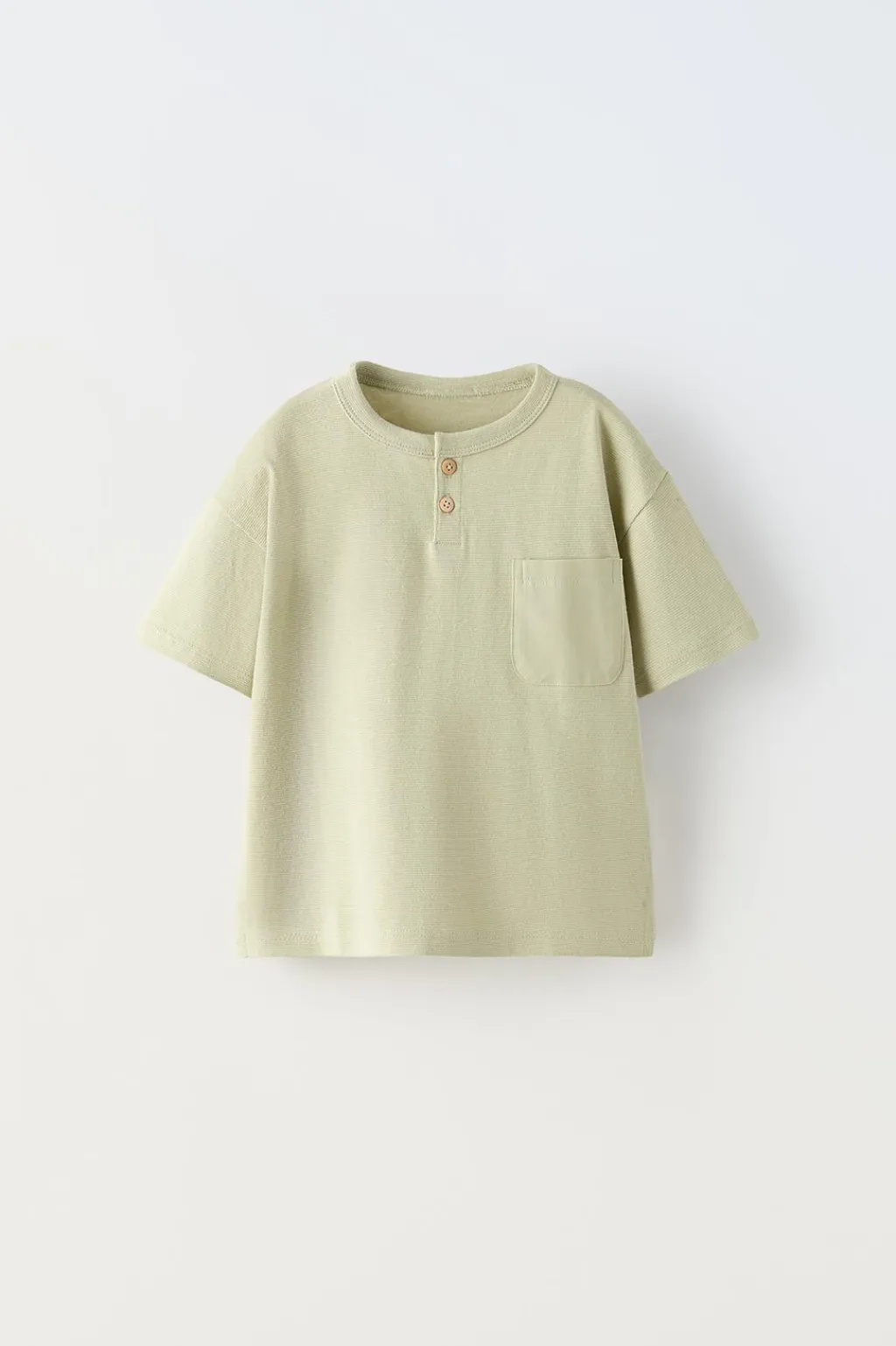 Camiseta con cuello panadero y manga corta. Bolsillo de tipo palstrón en pechera.