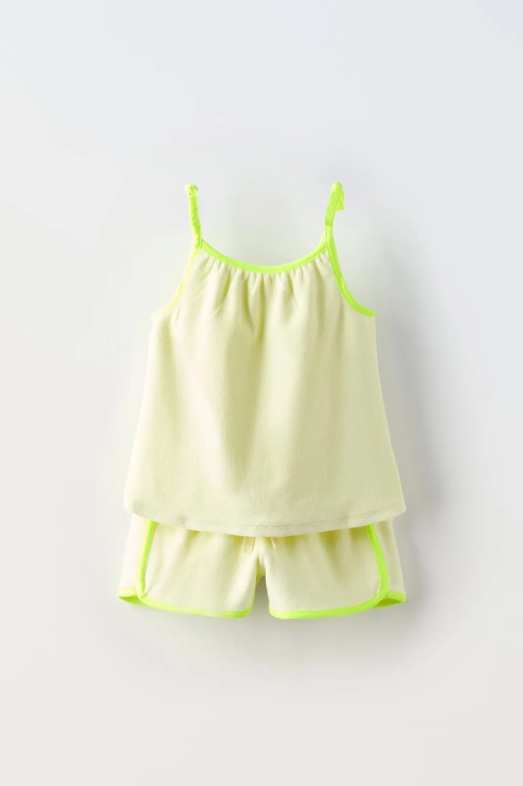 Conjunto toalla de dos piezas. Top con cuello recto y tirantes con aplique lazo. Detalle vivos color contraste. Bermuda con cinturilla elástica y aplique cordon frontal. Detalle vivos color contraste.