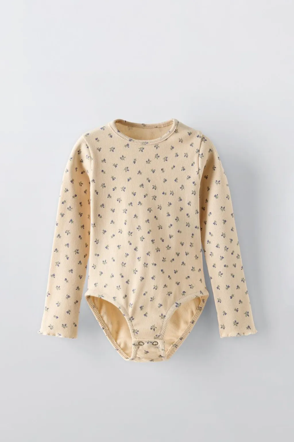 Body con cuello redondo y manga larga acabada en rizo. Cierre botones de tipo presión en bajo.