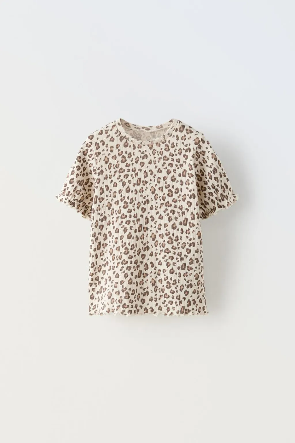 Camiseta con cuello redondo y manga corta acabada en goma. Acabados en ondas.