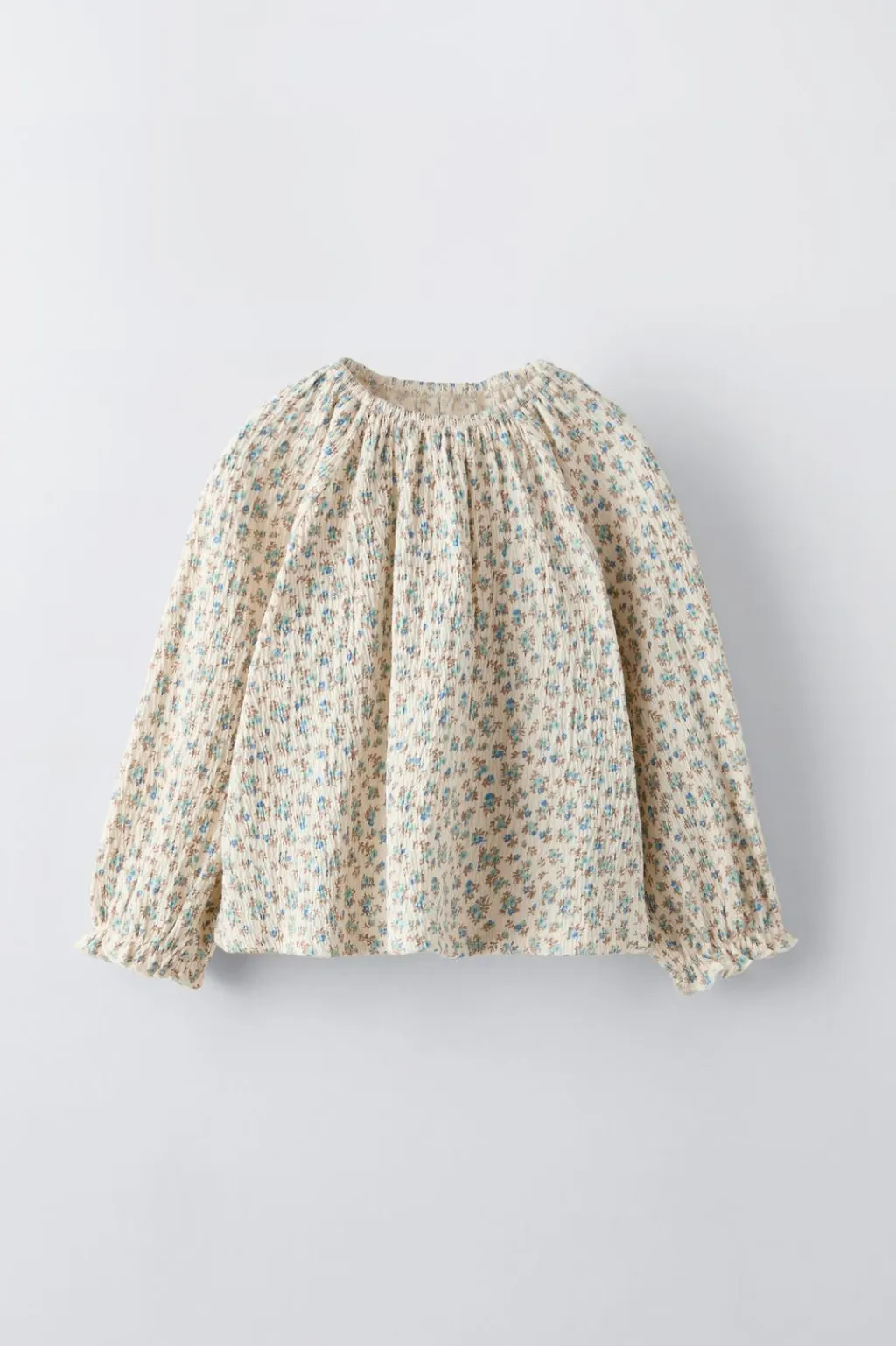 Blusa con cuello redondo y manga larga acabado en goma. Estampado flores.