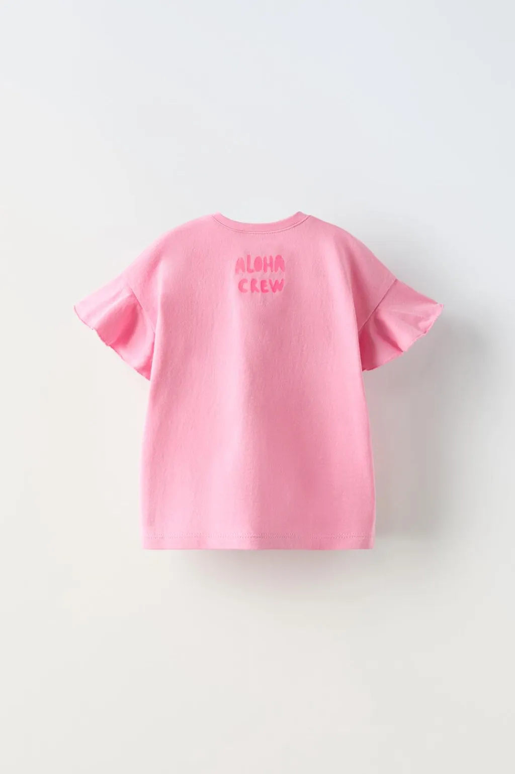Camiseta con cuello redondo y manga corta tipo volante. Aplique bordado flores en delantero.