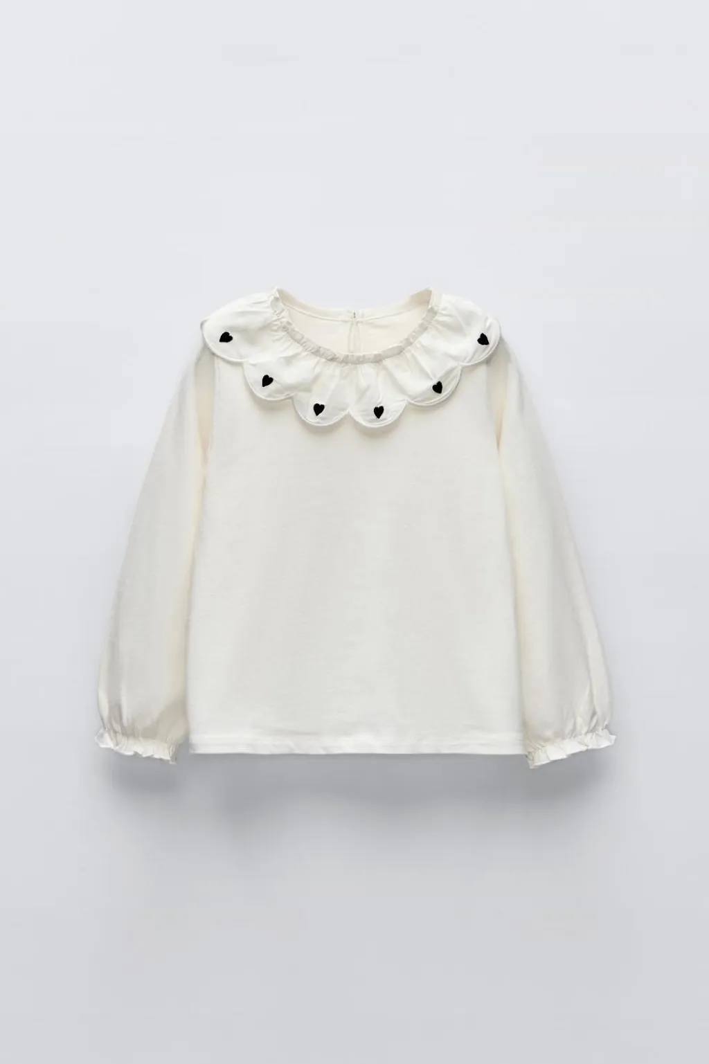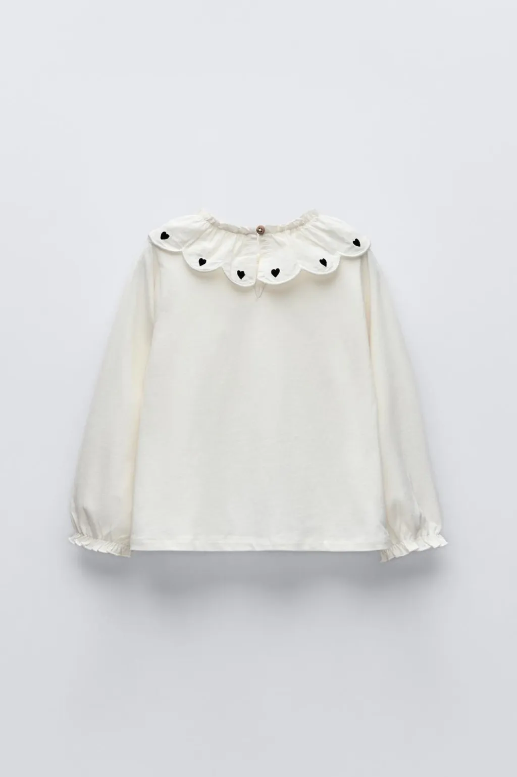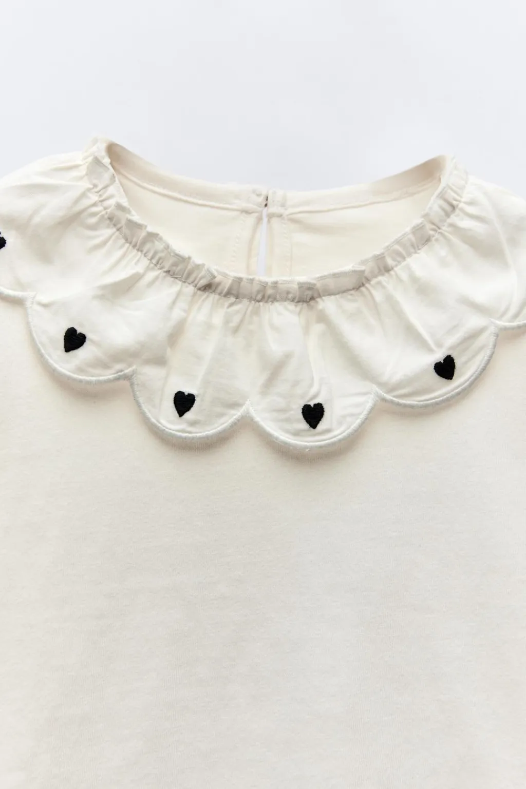 Camiseta con cuello redondo y manga larga acabada en goma. Aplique en cuello con flores bordadas. Cierre tipo lágrima con botón en espalda.