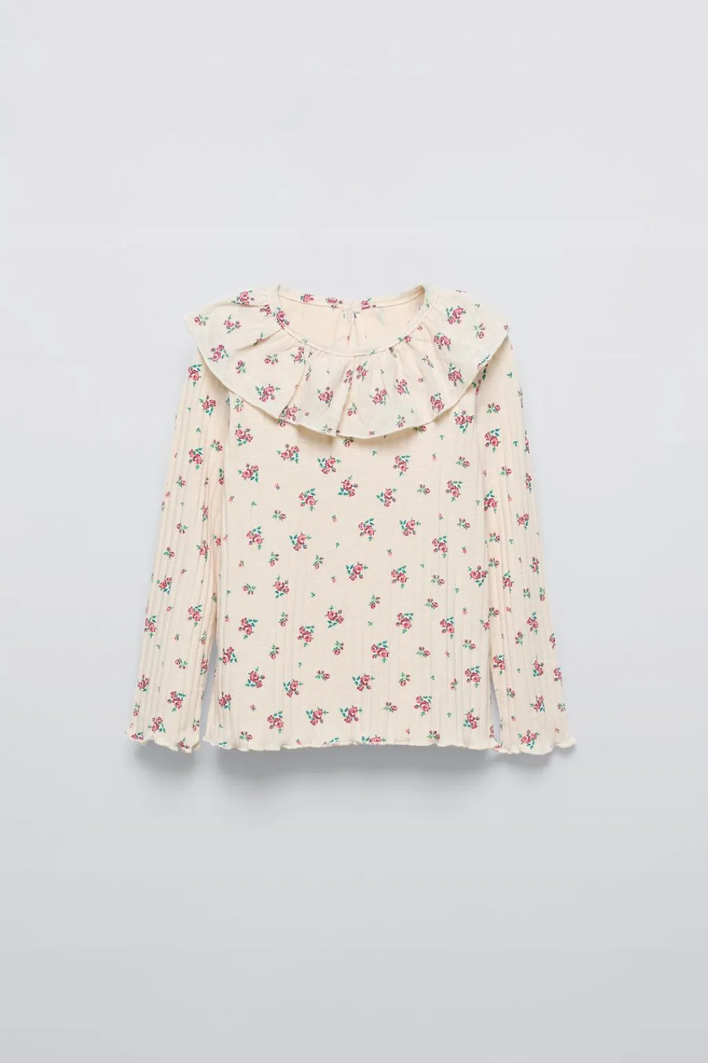 Camiseta con cuello babero y manga larga. Cierre tipo lágrima con botón en espalda. Acabados en rizo.