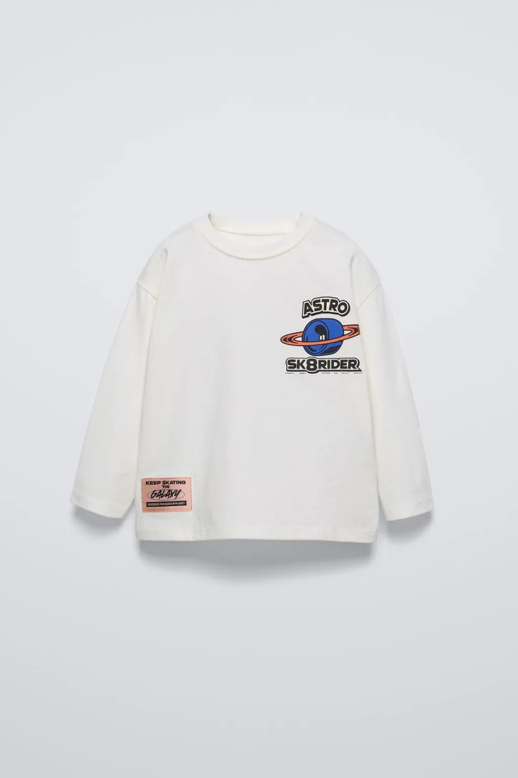 Camiseta con cuello redondo y manga larga. Estampado skate en pechera y espalda. Aplique etiqueta en bajo.