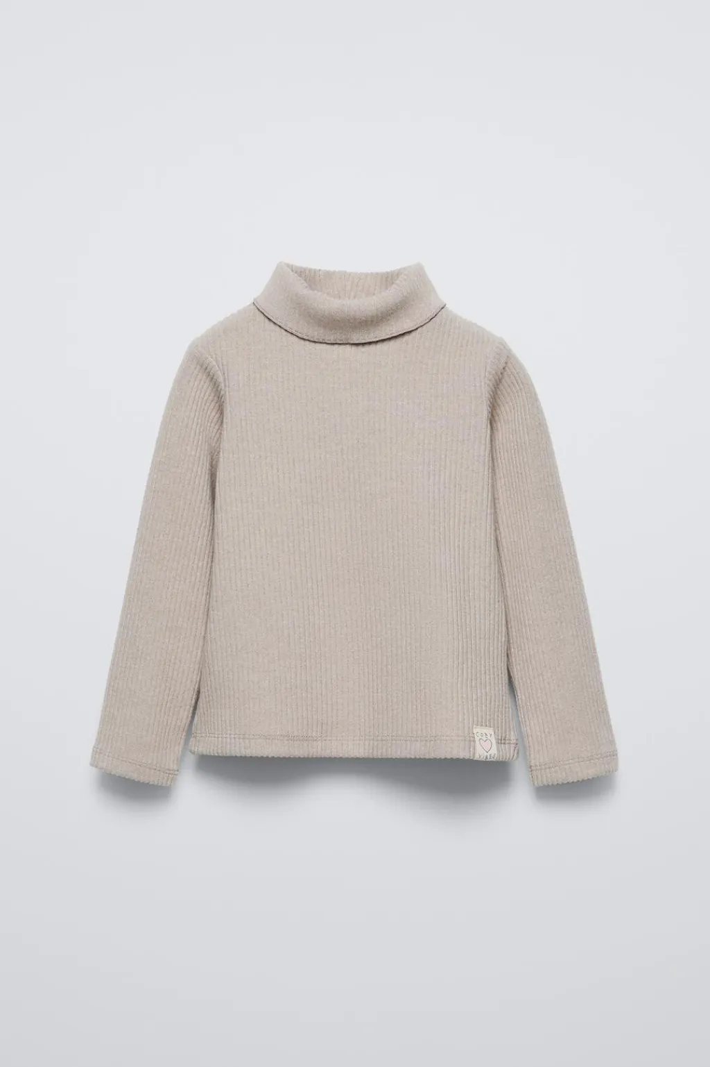 Camiseta rib con cuello vuelto y manga larga. Aplique etiqueta en bajo.
