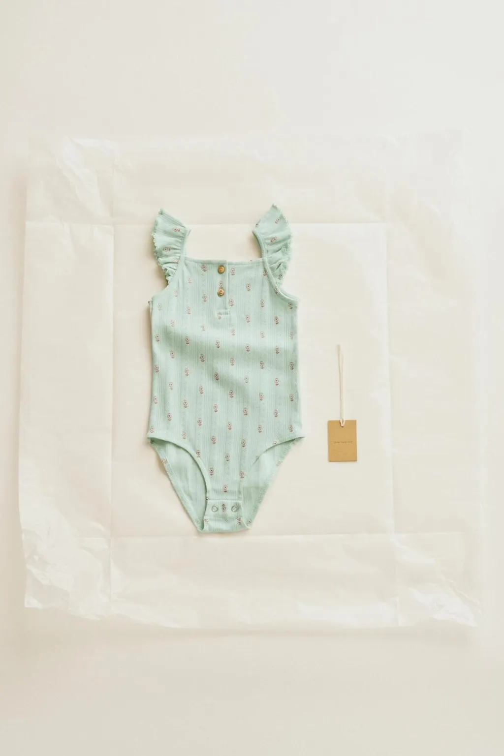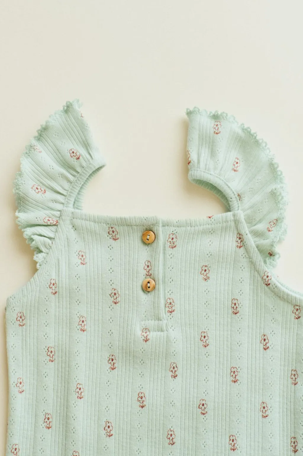 Body en un tejido de punto pointelle con pequeñas flores estampadas. El volante de los tirantes está acabado con una puntilla a tono. En el canesú tiene un botón de madera.